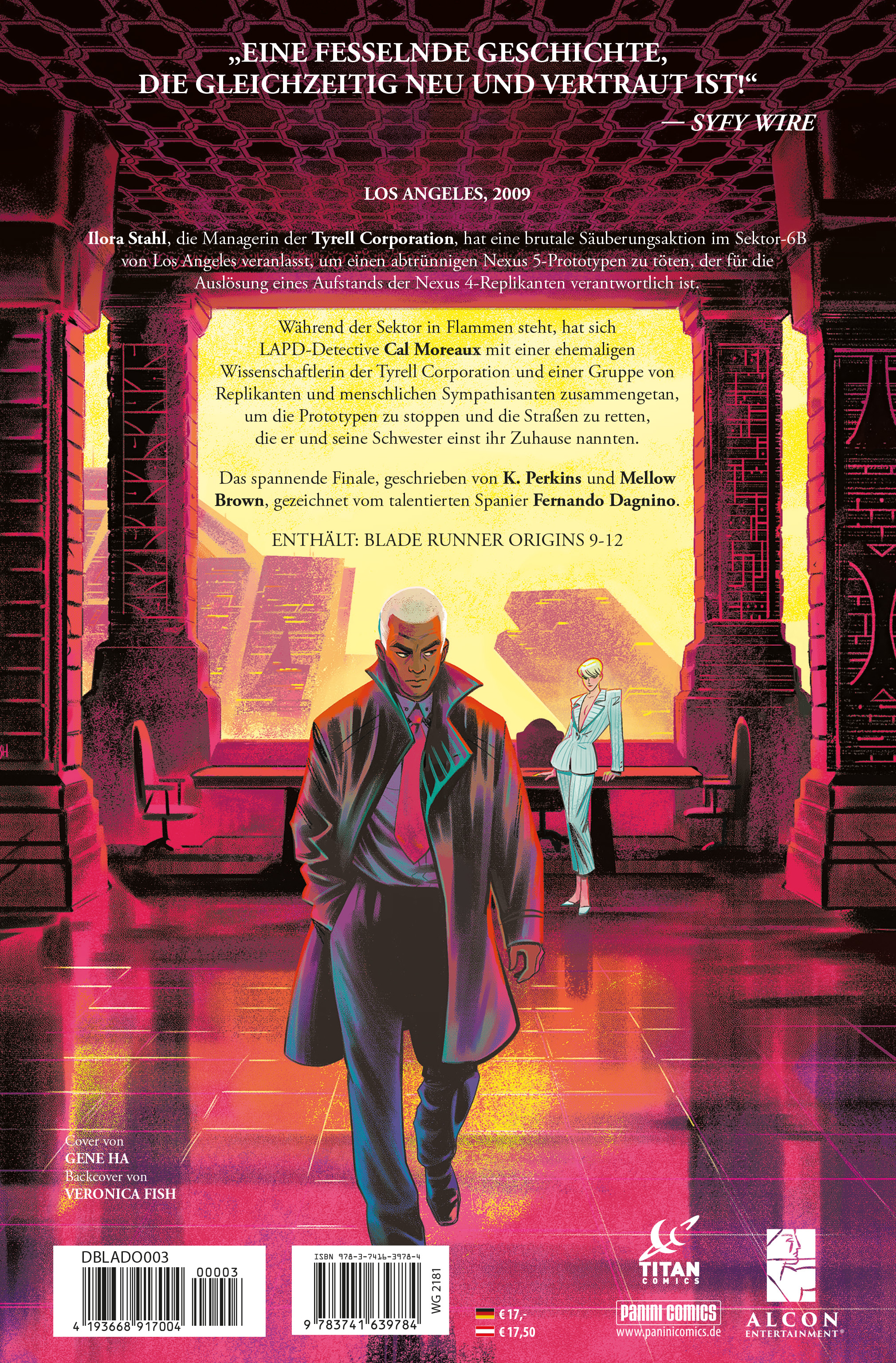 LOS ANGELES, 2009Ilora Stahl, die Managerin der Tyrell Corporation, hat eine brutale Säuberungsaktion im Sektor-6B von Los Angeles veranlasst, um einen abtrünnigen Nexus 5-Prototypen zu töten, der für die Auslösung eines Aufstands der Nexus 4-Replikanten verantwortlich ist.Während der Sektor in Flammen steht, hat sich LAPD-Detective Cal Moreaux mit einer ehemaligen Wissenschaftlerin der Tyrell Corporation und einer Gruppe von Replikanten und menschlichen Sympathisanten zusammengetan, um die Prototypen zu stoppen und die Straßen zu retten, die er und seine Schwester eins ihr Zuhause nannten.Das spannende Finale, geschrieben von K. Perkins und Mellow Brown, gezeichnet vom talentierten Spanier Fernando Dagnino.ENTHÄLT: BLADE RUNNER ORIGINS 9-12