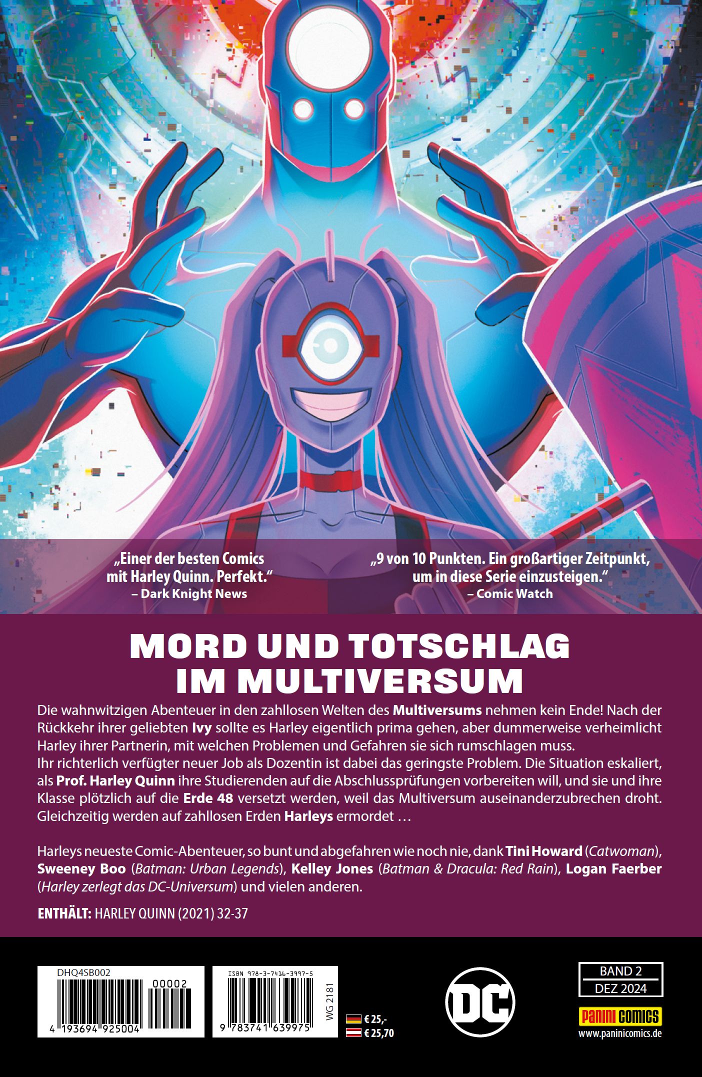 MORD UND TOTSCHLAGIM MULTIVERSUMDie wahnwitzigen Abenteuer in den zahllosen Welten des Multiversums nehmen kein Ende! Nach der Rückkehr ihrer geliebten Ivy sollte es Harley eigentlich prima gehen, aber dummerweise verheimlicht Harley ihrer Partnerin, mit welchen Problemen und Gefahren sie sich rumschlagen muss. Ihr richterlich verfügter neuer Job als Dozentin ist dabei das geringste Problem. Die Situation eskaliert, als Prof. Harley Quinn ihre Studierenden auf die Abschlussprüfungen vorbereiten will, und sie und ihre Klasse plötzlich auf die Erde 48 versetzt werden, weil das Multiversum auseinanderzubrechen droht. Gleichzeitig werden auf zahllosen Erden Harleys ermordet ... Harleys neueste Comic-Abenteuer, so bunt und abgefahren wie noch nie, dank Tini Howard (Catwoman), Sweeney Boo (Batman: Urban Legends), Kelley Jones (Batman & Dracula: Red Rain), Logan Faerber (Harley zerlegt das DC-Universum) und vielen anderen.ENTHÄLT: HARLEY QUINN (2021) 32-37