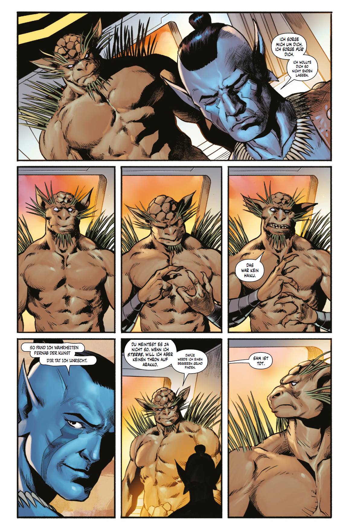 VORWORT von Thomas Witzler Seit die Mutanten von Arakko auf dem Mars eine neue Heimat gefunden haben, hat das martia-lische Volk einen monumentalen, kulturellen Wandel vollzogen. Zum ersten Mal seit Jahrzehnten ruhen die allzeit bereiten Waffen. Immer mehr Mutanten scheinen sich mit dem Gedanken anfreunden zu können, künftig ein Leben in Frieden zu führen. Die erstaunliche Entwicklung ist maßgeblich Storm zu verdanken, die sich ihren Platz als Regentin der Kriegergemeinschaft unter anderem in Zweikämpfen hart erarbeitet hatte. Analog zu Krakoas Stillem Konzil werden Arakkos Interessen vom Großen Ring vertreten. Das Führungsgremium besteht aus neun Hauptsitzen, die gleichmäßig unter den Kategorien Morgenröte, Tag und Abenddämmerung aufgeteilt sind und jeweils von Omega-Level- Mutanten besetzt werden. Zudem gibt es drei ursprünglich geheime Nachtsitze. Die Träger der Sitze dürfen in einem Duell herausgefordert werden und müssen im Falle einer Niederlage weichen. Als der Eternal Uranos vor Kurzem auf dem Mars ein Gemetzel anrichtete, hat er auch die Führungsstrukturen Arakkos erschüttert. In der Folge gab Storm den obersten Sitz an Lodus Logos ab und nahm ihrerseits den Sitz des toten Magneto ein. Um dem Planeten den Weg in eine friedvolle Zukunft zu ebnen, hat Ororo schon zuvor eine Bruderschaft gegründet, der einige aktuelle und frühere Mitglieder des Großen Rings angehören – aber auch Nicht-Mutanten wie der Fischerkönig oder Nova. Doch nicht alle Arakki sind gewillt, die Veränderungen mit offenen Armen zu empfangen. Für sie ist es ein Verrat an jahrtausendealten Traditionen. Dazu zählt auch Genesis, die mithilfe vom Akkaba-Zirkel und Orchis nach Arakko zurückgekehrt ist. Die Ex- Gemahlin von Apocalypse und gegenwärtige Trägerin des Annihilation-Stabs weigert sich, mit den früheren Werten zu brechen. Mit scharfen Worten säte sie Zwietracht im Großen Ring. Doch Lactuca teleportierte Storm und ihre Verbündeten hinfort, bevor es zum Kampf kommen konnte. Nun droht ein Bürgerkrieg den Mars in Brand zu setzen.