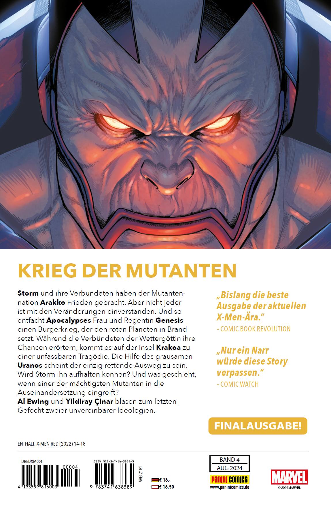 KRIEG DER MUTANTENStorm und ihre Bruderschaft der Mutanten haben der Mutantennation Arakko Frieden gebracht. Aber nicht jeder ist mit den Veränderungen einverstanden. Und so entfacht Apocalypse Frau und Regentin Genesis einen Bürgerkrieg, der den roten Planeten in Brand setzt. Während die Verbündeten der Wettergöttin ihre Chancen erörtern, kommt es auf der Insel Krakoa zu einer unfassbaren Tragödie. Die Hilfe des grausamen Uranos scheint der einzig rettende Ausweg zu sein. Wird Storm ihn aufhalten können? Und was geschieht, wenn einer der mächtigsten Mutanten in die Auseinandersetzung eingreift? Al Ewing und Yildiray Çinar blasen zum letzten Gefecht zweier unvereinbarer Ideologien.ENTHÄLT: X-MEN RED (2022) 14-18FINALAUSGABE!