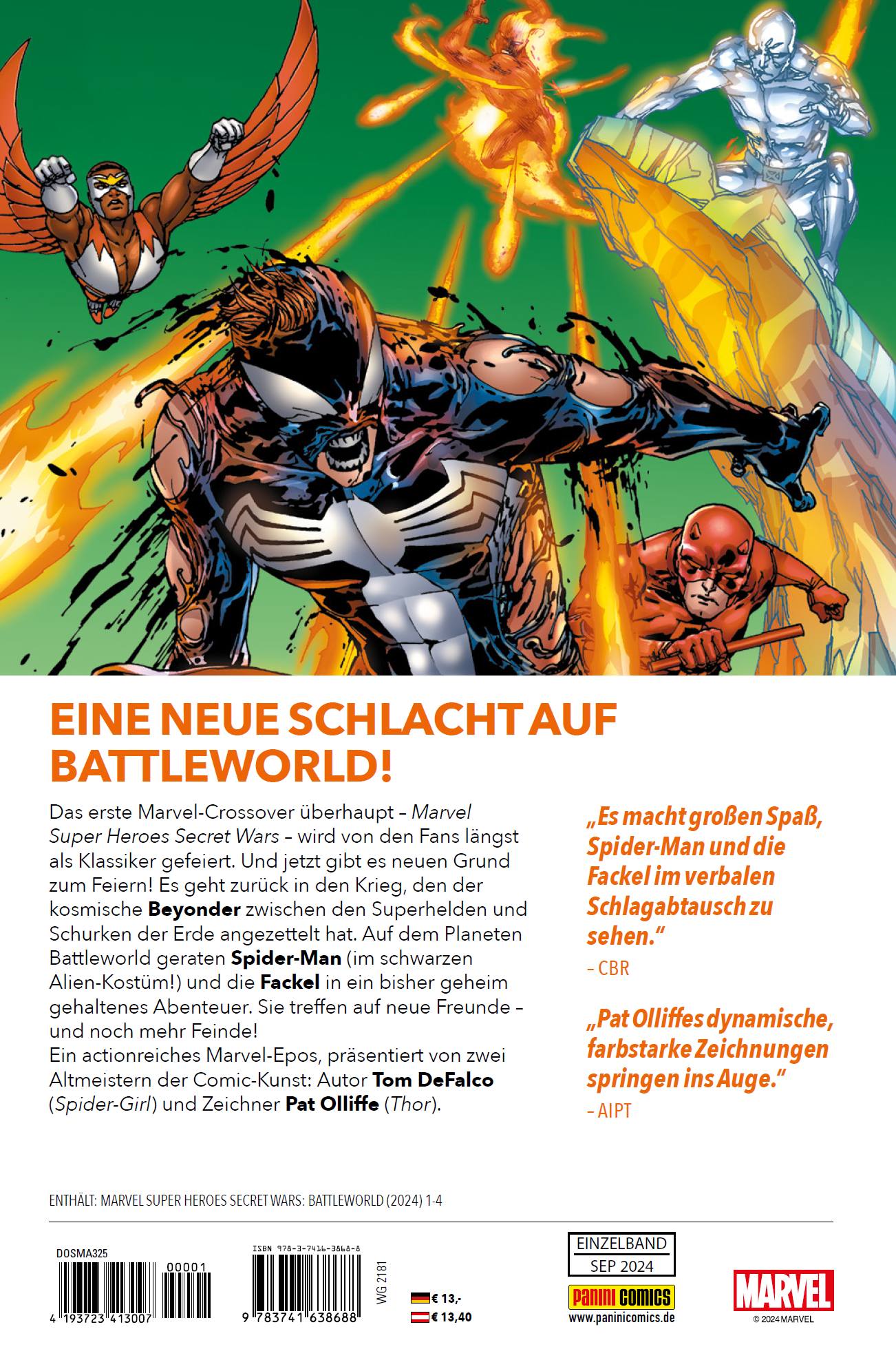 EINE NEUE SCHLACHT AUF BATTLEWORLD! Das erste Marvel-Crossover überhaupt - Marvel Super Heroes Secret Wars - wird von den Fans längst als Klassiker gefeiert. Und jetzt gibt es neuen Grund zum Feiern! Es geht zurück in den Krieg, den der kosmische Beyonder zwischen den Superhelden und Schurken der Erde angezettelt hat. Auf dem Planeten Battleworld geraten Spider-Man (im schwarzen Alien-Kostüm!) und die Fackel in ein bisher geheim gehaltenes Abenteuer. Sie treffen auf neue Freunde - und noch mehr Feinde! Ein actionreiches Marvel-Epos, präsentiert von zwei Altmeistern der Comic-Kunst: Autor Tom DeFalco (Spider-Girl) und Zeichner Pat Olliffe (Thor). ENTHÄLT: MARVEL SUPER HEROES SECRET WARS: BATTLEWORLD (2024) 1-4