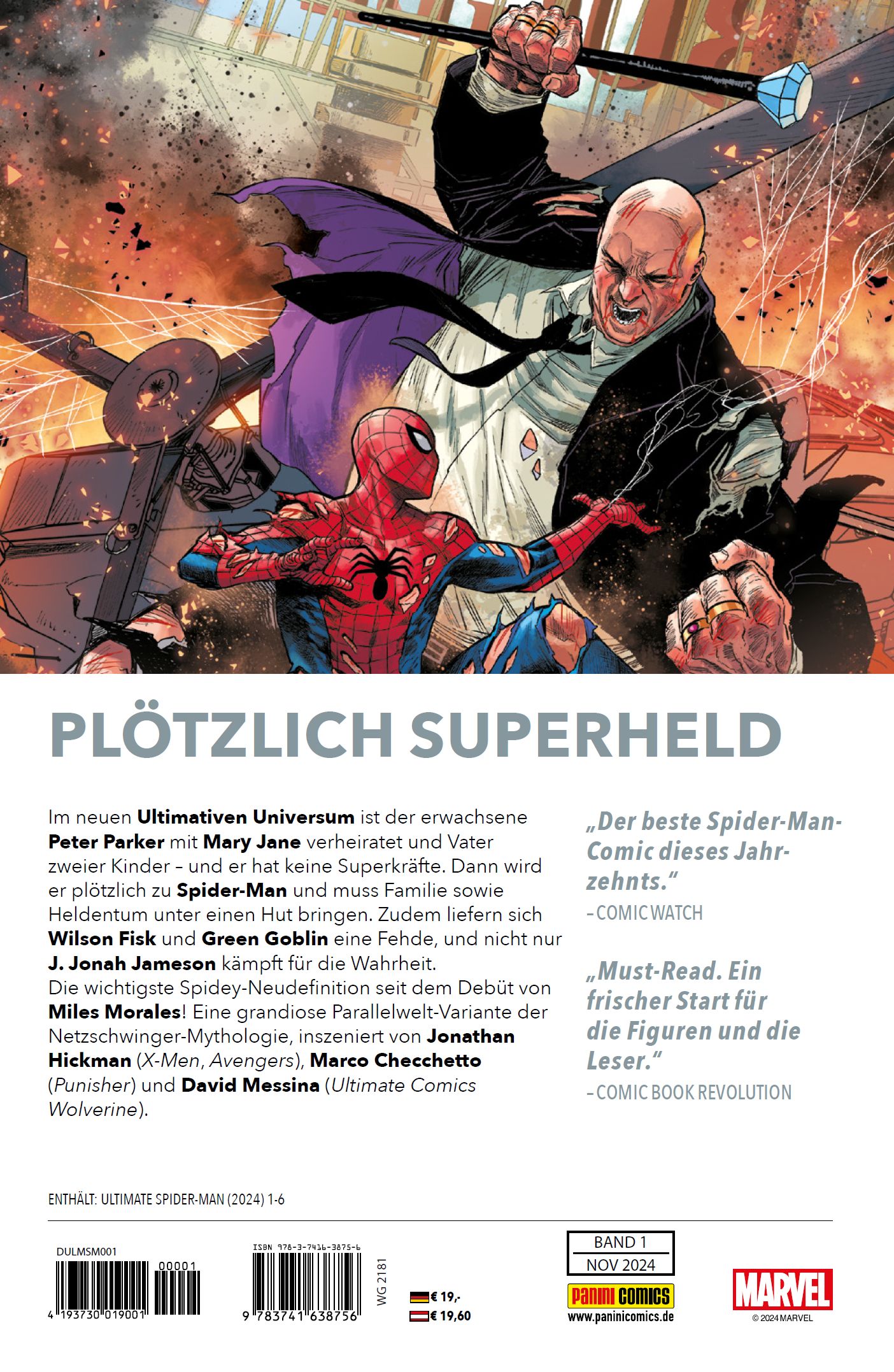 PLÖTZLICH SUPERHELDIm neuen Ultimativen Universum ist der erwachsene Peter Parker mit Mary Jane verheiratet und Vater zweier Kinder - und er hat keine Superkräfte. Dann wird er plötzlich zu Spider-Man und muss Familie sowie Heldentum unter einen Hut bringen. Zudem liefern sich Wilson Fisk und Green Goblin eine Fehde, und nicht nur J. Jonah Jameson kämpft für die Wahrheit. Die wichtigste Spidey-Neudefinition seit dem Debüt von Miles Morales! Eine grandiose Parallelwelt-Variante der Netzschwinger-Mythologie, inszeniert von Jonathan Hickman (X-Men, Avengers), Marco Checchetto (Punisher) und David Messina (Ultimate Comics Wolverine).ENTHÄLT: ULTIMATE SPIDER-MAN (2024) 1-6