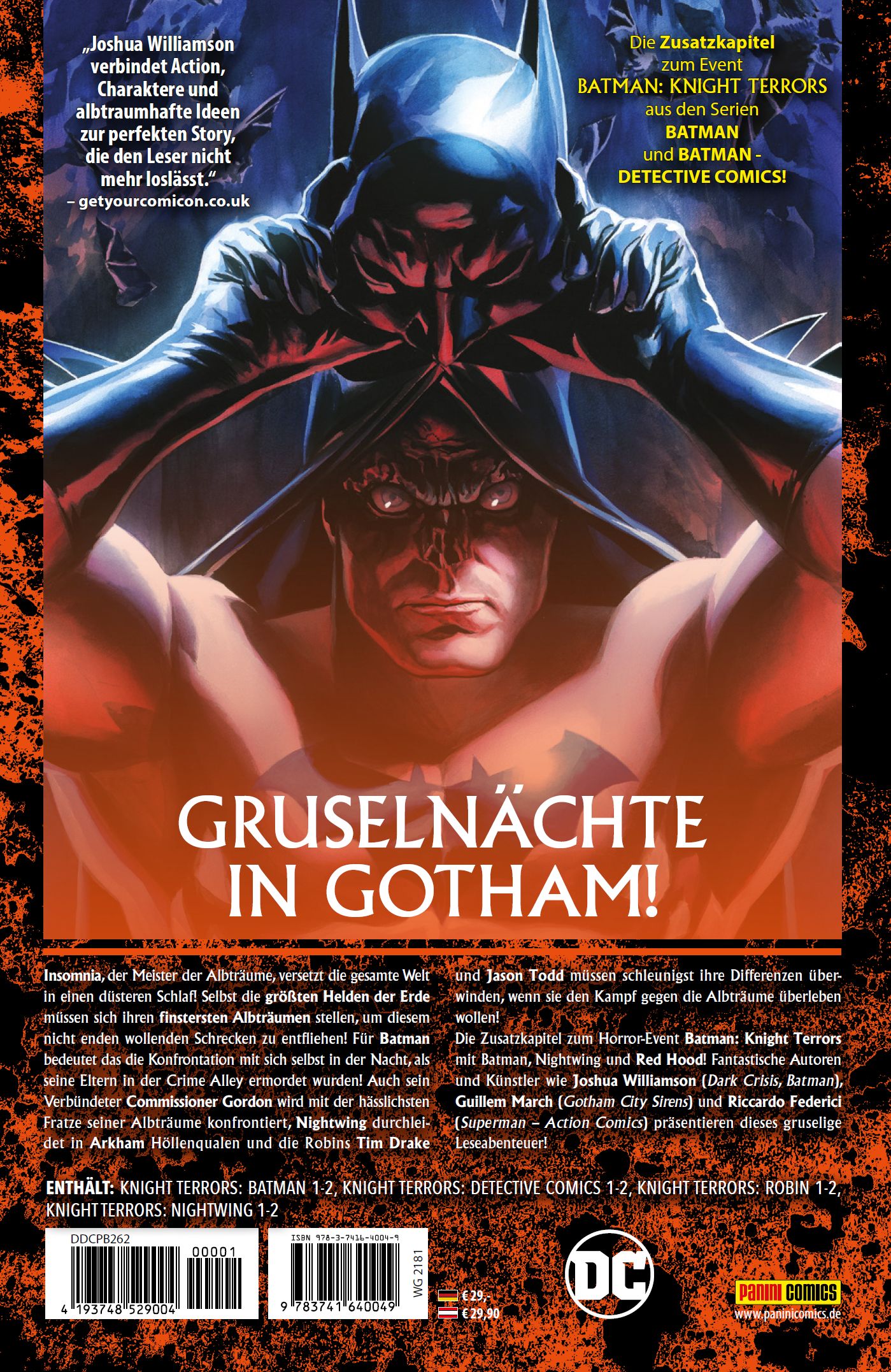 GRUSELNÄCHTE IN GOTHAM!Insomnia, der Meister der Albträume, versetzt die gesamte Welt in einen düsteren Schlaf! Selbst die größten Helden der Erde müssen sich ihren finstersten Albträumen stellen, um diesem nicht enden wollenden Schrecken zu entfliehen! Für Batman bedeutet das die Konfrontation mit sich selbst in der Nacht, als seine Eltern in der Crime Alley ermordet wurden! Auch sein Verbündeter Commissioner Gordon wird mit der hässlichsten Fratze seiner Albträume konfrontiert, Nightwing durchleidet in Arkham Höllenqualen und die Robins Tim Drake und Jason Todd müssen schleunigst ihre Differenzen überwinden, wenn sie den Kampf gegen die Albträume überleben wollen! Die Zusatzkapitel zum Horror-Event Batman: Knight Terrors mit Batman, Nightwing und Red Hood! Fantastische Autoren und Künstler wie Joshua Williamson (Dark Crisis, Batman), Guillem March (Gotham City Sirens) und Riccardo Federici (Superman - Action Comics) präsentieren dieses gruselige Leseabenteuer!Die Zusatzkapitel zum Event BATMAN: KNIGHT TERRORS aus den Serien BATMAN und BATMAN - DETECTIVE COMICS! ENTHÄLT: KNIGHT TERRORS: BATMAN 1-2, KNIGHT TERRORS: DETECTIVE COMICS 1-2, KNIGHT TERRORS: ROBIN 1-2, KNIGHT TERRORS: NIGHTWING 1-2