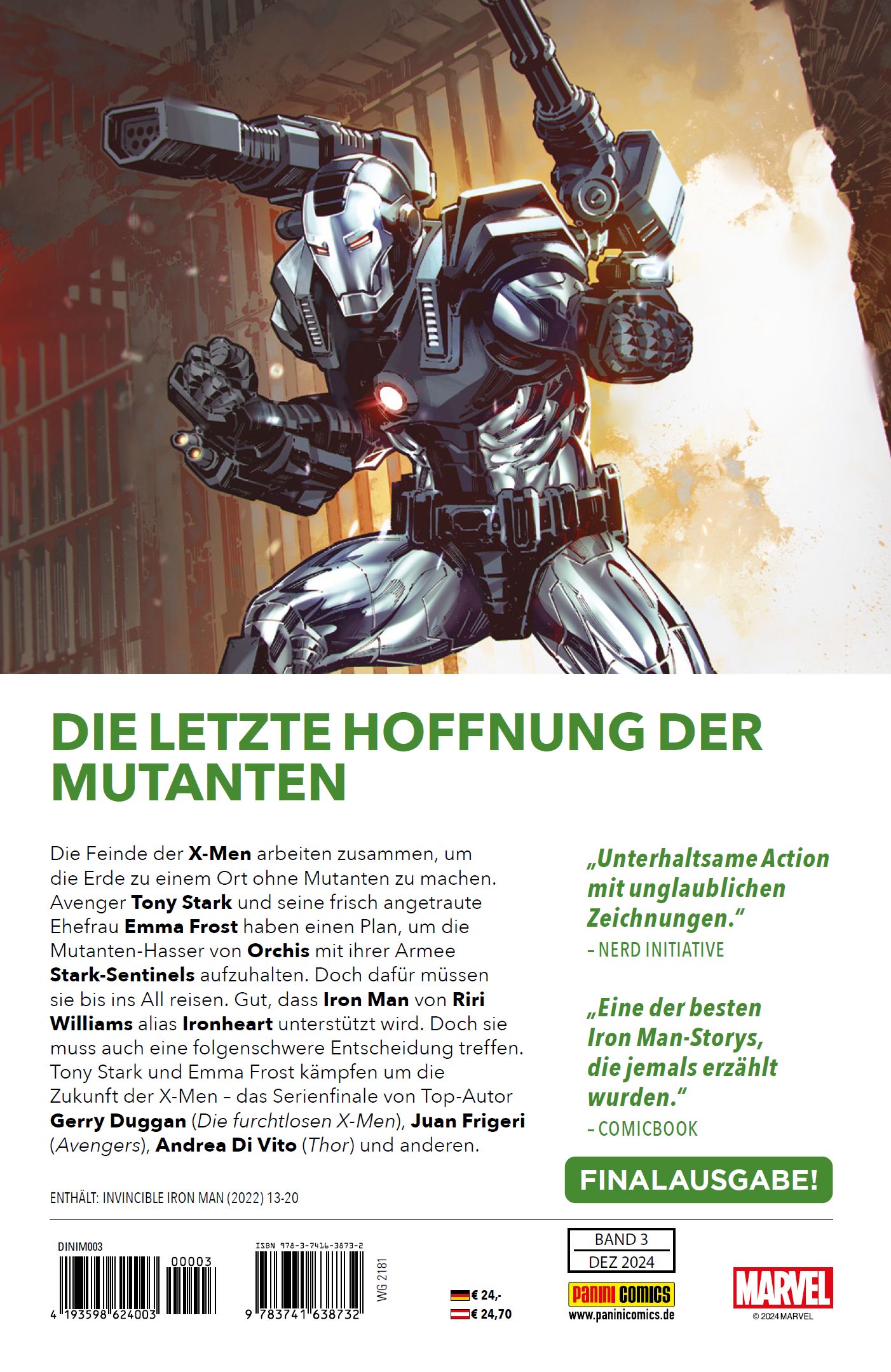DIE LETZTE HOFFNUNG DER MUTANTENDie Feinde der X-Men arbeiten zusammen, um die Erde zu einem Ort ohne Mutanten zu machen. Avenger Tony Stark und seine frisch angetraute Ehefrau Emma Frost haben einen Plan, um die Mutanten-Hasser von Orchis mit ihrer Armee Stark-Sentinels aufzuhalten. Doch dafür müssen sie bis ins All reisen. Gut, dass Iron Man von Riri Williams alias Ironheart unterstützt wird. Doch sie muss auch eine folgenschwere Entscheidung treffen. Tony Stark und Emma Frost kämpfen um die Zukunft der X-Men - das Serienfinale von Top-Autor Gerry Duggan (X-Men), Juan Frigeri (Avengers), Andrea Di Vito (Thor) und anderen.FINALAUSGABE!ENTHÄLT: INVINCIBLE IRON MAN (2022) 13-20