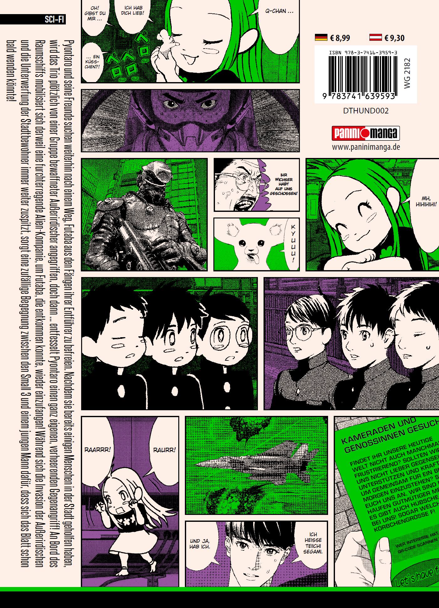 THUNDER 3 - Das ultimative Manga-Abenteuer im Multiversum!Begleite drei Freunde, die aus einem klassischen Gag-Manga im Retro-Look in eine hyperrealistische Sci-Fi-Welt im Gantz-Stil springen, um die kleine Schwester von einem der Jungen zu retten. Auf ihrem Abenteuer werden sie allerdings nicht nur mit gefährlichen Gegnern, skurrilen Situationen und überraschenden Wendungen konfrontiert ...Das erwartet dich in Band 2:Pyontaro und seine Freunde suchen weiterhin nach einem Weg, Futaba aus den Fängen ihrer Entführer zu befreien. Nachdem sie bereits einigen Menschen in der Stadt geholfen haben, wird das Trio plötzlich von einer Gruppe bewaffneter Außerirdischer angegriffen, doch dann ... entfesselt Pyontaro einen ganz eigenen, verheerenden Gegenangriff! An Bord des Raumschiffs mobilisiert sich derweil eine furchterregende Alien-Kompanie, um Futaba, die entkommen konnte, wieder einzufangen! Während sich die Invasion der Außerirdischen und die Unterwerfung der Stadtbewohner immer weiter zuspitzt, sorgt eine zufällige Begegnung zwischen den Small 3 und einem jungen Mann dafür, dass sich das Blatt schon bald wenden könnte!Für Fans von Action-, Abenteuer- und Sci-Fi-Manga!