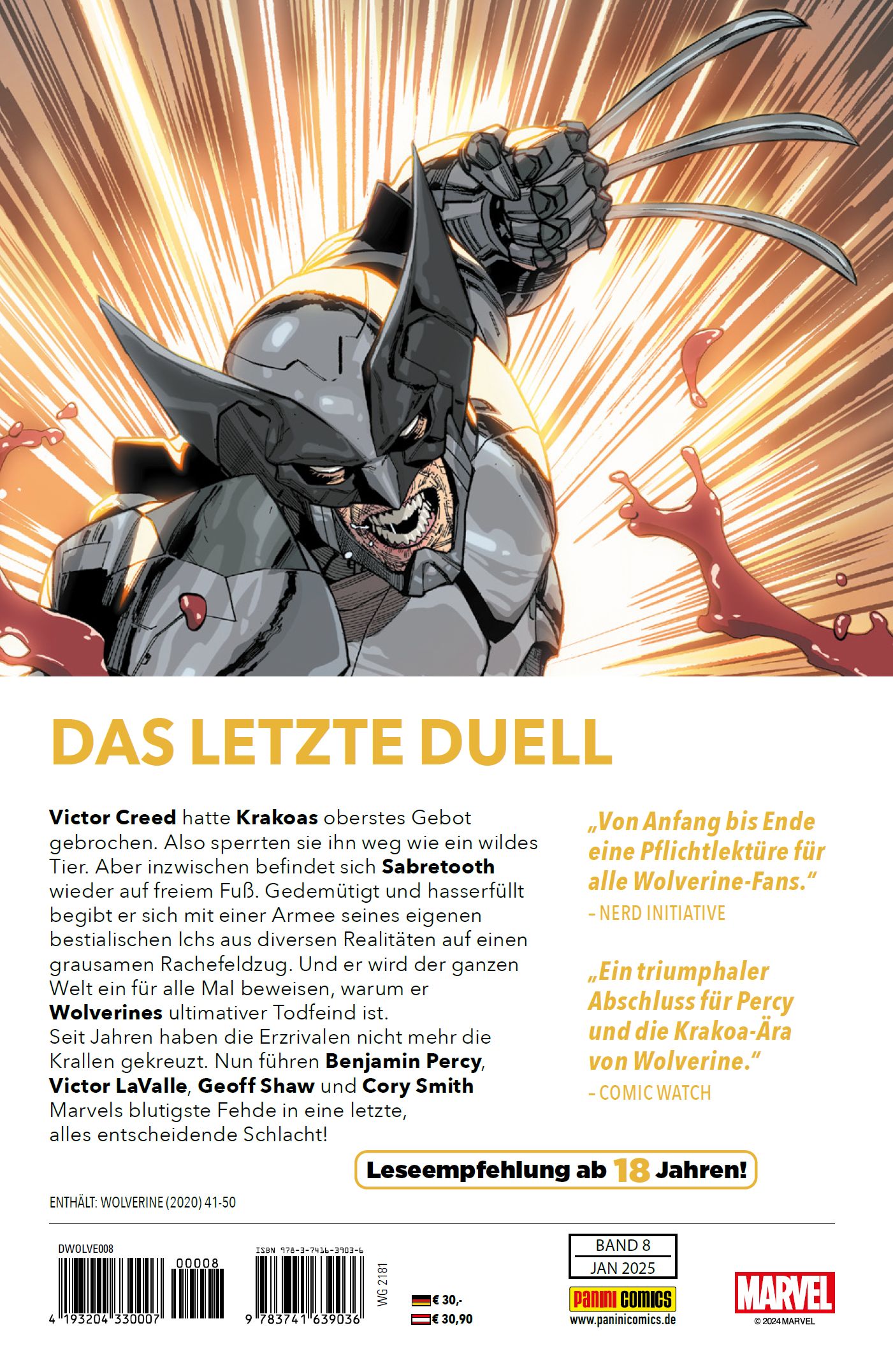 DAS LETZTE DUELLVictor Creed hatte Krakoas oberstes Gebot gebrochen. Also sperrten sie ihn weg wie ein wildes Tier. Aber inzwischen befindet sich Sabretooth wieder auf freiem Fuß. Gedemütigt und hasserfüllt begibt er sich mit einer Armee seines eigenen bestialischen Ichs aus diversen Realitäten auf einen grausamen Rachefeldzug. Und er wird der ganzen Welt ein für alle Mal beweisen, warum er Wolverines ultimativer Todfeind ist. Seit Jahren haben die Erzrivalen nicht mehr die Krallen gekreuzt. Nun führen Ben Percy, Victor LaValle, Geoff Shaw und Cory Smith Marvels blutigste Fehde in eine letzte, alles entscheidende Schlacht!ENTHÄLT: WOLVERINE (2020) 41-50LESEEMPFEHLUNG AB 18 JAHREN!