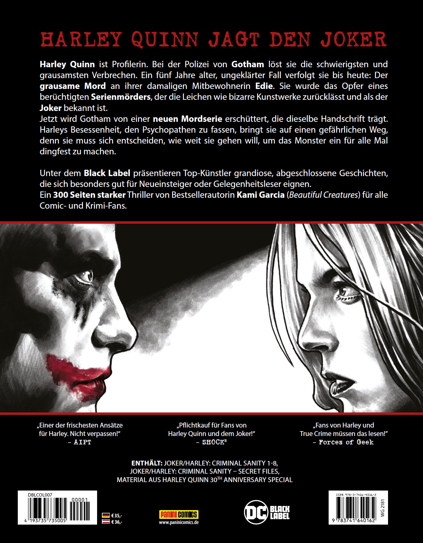 HARLEY QUINN JAGT DEN JOKERHarley Quinn ist Profilerin. Bei der Polizei von Gotham löst sie die schwierigsten und grausamsten Verbrechen. Ein fünf Jahre alter, ungeklärter Fall verfolgt sie bis heute: Der grausame Mord an ihrer damaligen Mitbewohnerin Edie. Sie wurde das Opfer eines berüchtigten Serienmörders, der die Leichen wie bizarre Kunstwerke zurücklässt und als der Joker bekannt ist. Jetzt wird Gotham von einer neuen Mordserie erschüttert, die dieselbe Handschrift trägt. Harleys Besessenheit, den Psychopathen zu fassen, bringt sie auf einen gefährlichen Weg, denn sie muss sich entscheiden, wie weit sie gehen will, um das Monster ein für alle Mal dingfest zu machen.Unter dem Black Label präsentieren Top-Künstler grandiose, abgeschlossene Geschichten, die sich besonders gut für Neueinsteiger oder Gelegenheitsleser eignen. Ein 300 Seiten starker Thriller von Bestsellerautorin Kami Garcia (Beautiful Creatures) für alle Comic- und Krimi-Fans.ENTHÄLT: JOKER/HARLEY: CRIMINAL SANITY 1-8, JOKER/HARLEY: CRIMINAL SANITY - SECRET FILES, MATERIAL AUS HARLEY QUINN 30TH ANNIVERSARY SPECIAL
