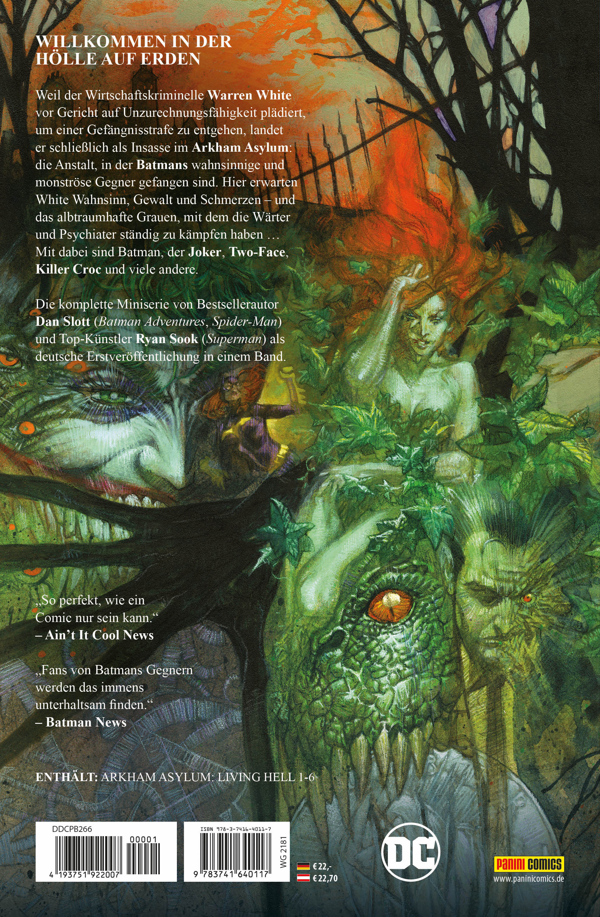 WILLKOMMEN IN DER HÖLLE AUF ERDENWeil der Wirtschaftskriminelle Warren White vor Gericht auf Unzurechnungsfähigkeit plädiert, um einer Gefängnisstrafe zu entgehen, landet er schließlich als Insasse im Arkham Asylum: die Anstalt, in der Batmans wahnsinnige und monströse Gegner gefangen sind. Hier erwarten White Wahnsinn, Gewalt und Schmerzen - und das albtraumhafte Grauen, mit dem die Wärter und Psychiater ständig zu kämpfen haben ... Mit dabei sind Batman, der Joker, Two-Face, Killer Croc und viele andere.Die komplette Miniserie von Bestsellerautor Dan Slott (Batman Adventures, Spider-Man) und Top- Künstler Ryan Sook (Superman) als deutsche Erstveröffentlichung in einem Band.ENTHÄLT: ARKHAM ASYLUM: LIVING HELL 1-6