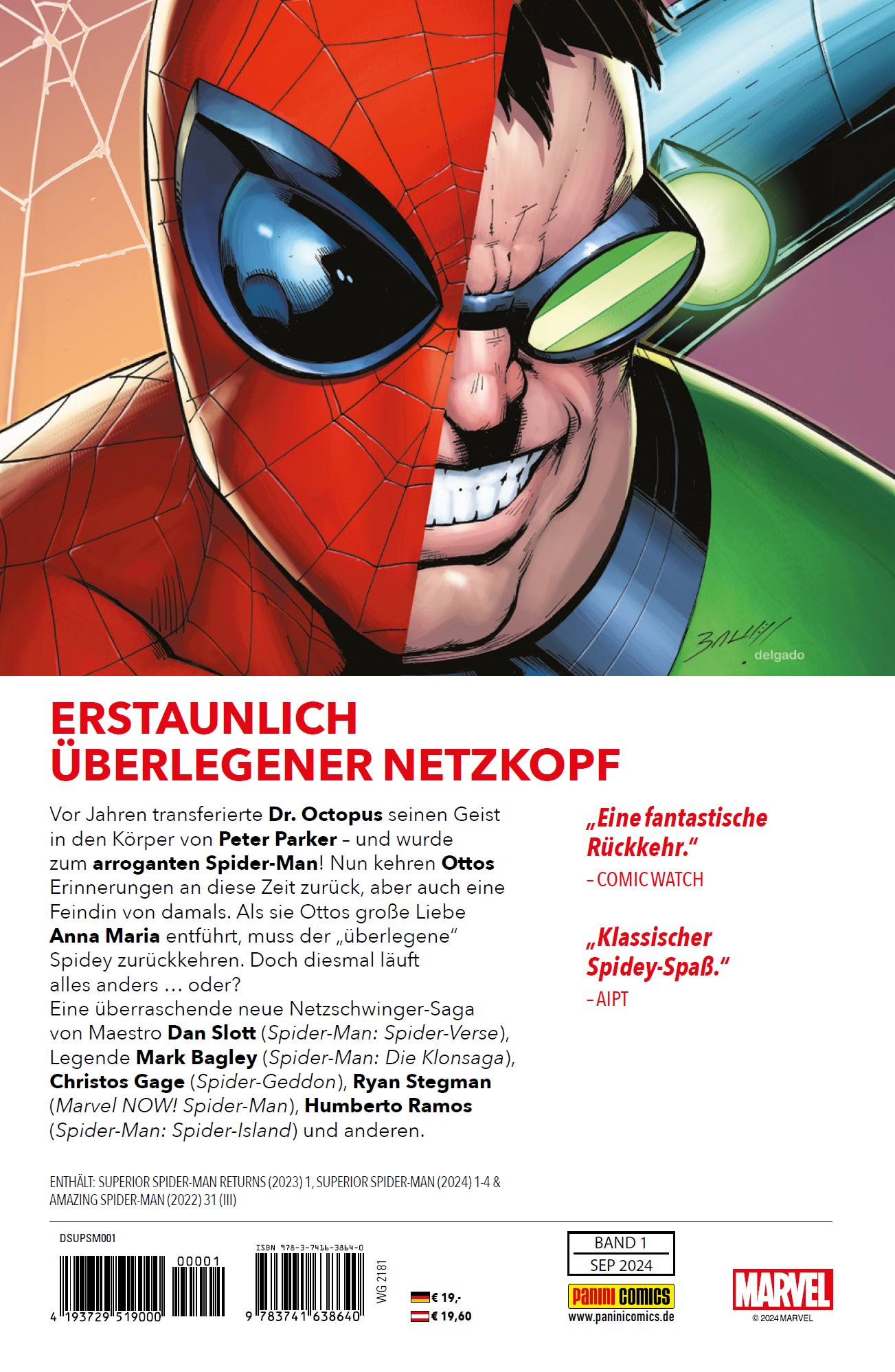 ERSTAUNLICH ÜBERLEGENER NETZKOPFVor Jahren hat Dr. Octopus seinen Geist in den Körper von Peter Parker transferiert - und wurde zum arroganten Spider-Man! Nun kehren Ottos Erinnerungen an diese Zeit zurück, aber auch eine Feindin von damals. Als sie Ottos große Liebe Anna Maria entführt, muss der "überlegene" Spidey zurückkehren. Doch diesmal läuft alles anders ... oder? Eine überraschende neue Netzschwinger-Saga von Maestro Dan Slott (Spider-Man: Spider-Verse), Legende Mark Bagley (Spider-Man: Die Klonsaga), Christos Gage (Spider-Geddon), Ryan Stegman (Marvel NOW! Spider-Man), Humberto Ramos (Spider-Man: Spider-Island) und anderen.ENTHÄLT: SUPERIOR SPIDER-MAN RETURNS (2023) 1, SUPERIOR SPIDER-MAN (2024) 1-4 & AMAZING SPIDER-MAN (2022) 31 (III)