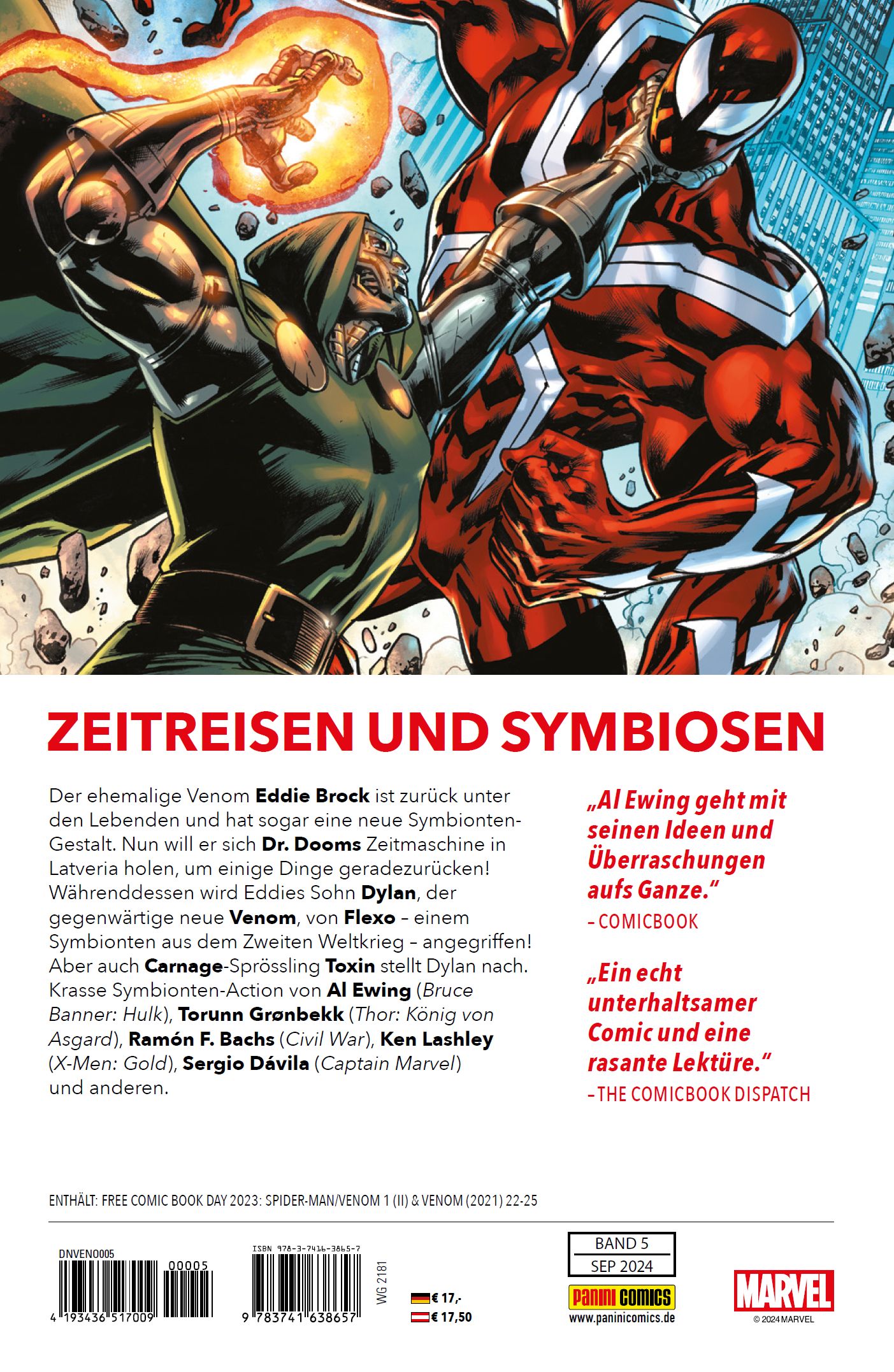 ZEITREISEN UND SYMBIOSEN Der ehemalige Venom Eddie Brock ist zurück unter den Lebenden und hat sogar eine neue Symbionten- Gestalt. Nun will er sich Dr. Dooms Zeitmaschine in Latveria holen, um einige Dinge geradezurücken! Währenddessen wird Eddies Sohn Dylan, der gegenwärtige neue Venom, von Flexo - einem Symbionten aus dem Zweiten Weltkrieg - angegriffen! Aber auch Carnage-Sprössling Toxin stellt Dylan nach. Krasse Symbionten-Action von Al Ewing (Bruce Banner: Hulk), Torunn Grønbekk (Thor: König von Asgard), Ramón F. Bachs (Civil War), Ken Lashley (X-Men: Gold), Sergio Dávila (Captain Marvel) und anderen.ENTHÄLT: FREE COMIC BOOK DAY 2023: SPIDER-MAN/VENOM 1 (II) & VENOM (2021) 22-25