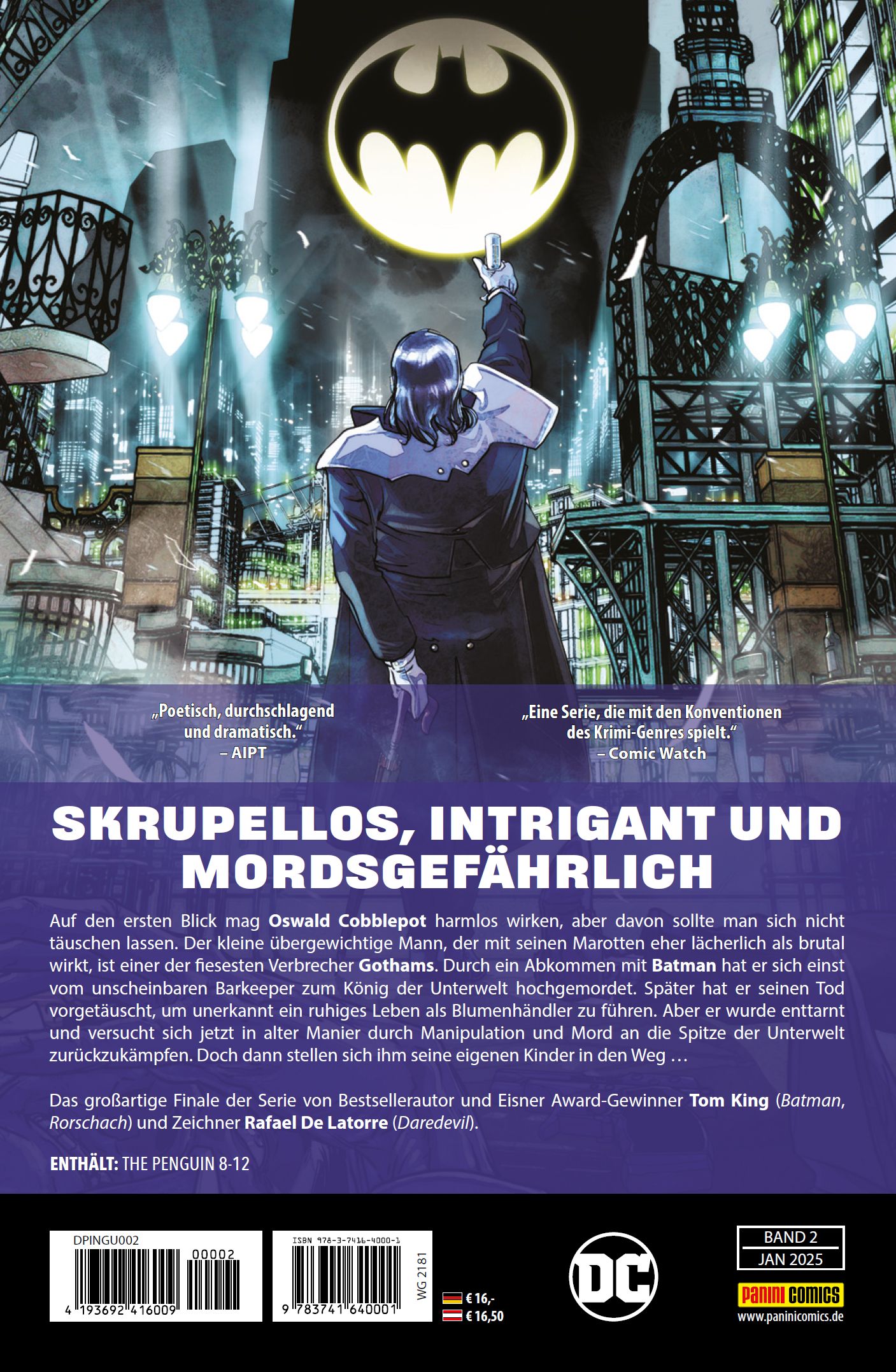 SKRUPELLOS, INTRIGANT UND MORDSGEFÄHRLICH Auf den ersten Blick mag Oswald Cobblepot harmlos wirken, aber davon sollte man sich nicht täuschen lassen. Der kleine übergewichtige Mann, der mit seinen Marotten eher lächerlich als brutal wirkt, ist einer der fiesesten Verbrecher Gothams. Durch ein Abkommen mit Batman hat er sich einst vom unscheinbaren Barkeeper zum König der Unterwelt hochgemordet. Später hat er seinen Tod vorgetäuscht, um unerkannt ein ruhiges Leben als Blumenhändler zu führen. Aber er wurde enttarnt und versucht sich jetzt in alter Manier durch Manipulation und Mord an die Spitze der Unterwelt zurückzukämpfen. Doch dann stellen sich ihm seine eigenen Kinder in den Weg ... Das großartige Finale der Serie von Bestsellerautor und Eisner Award-Gewinner Tom King (Batman, Rorschach) und Zeichner Rafael De Latorre (Daredevil). ENTHÄLT: THE PENGUIN 8-12