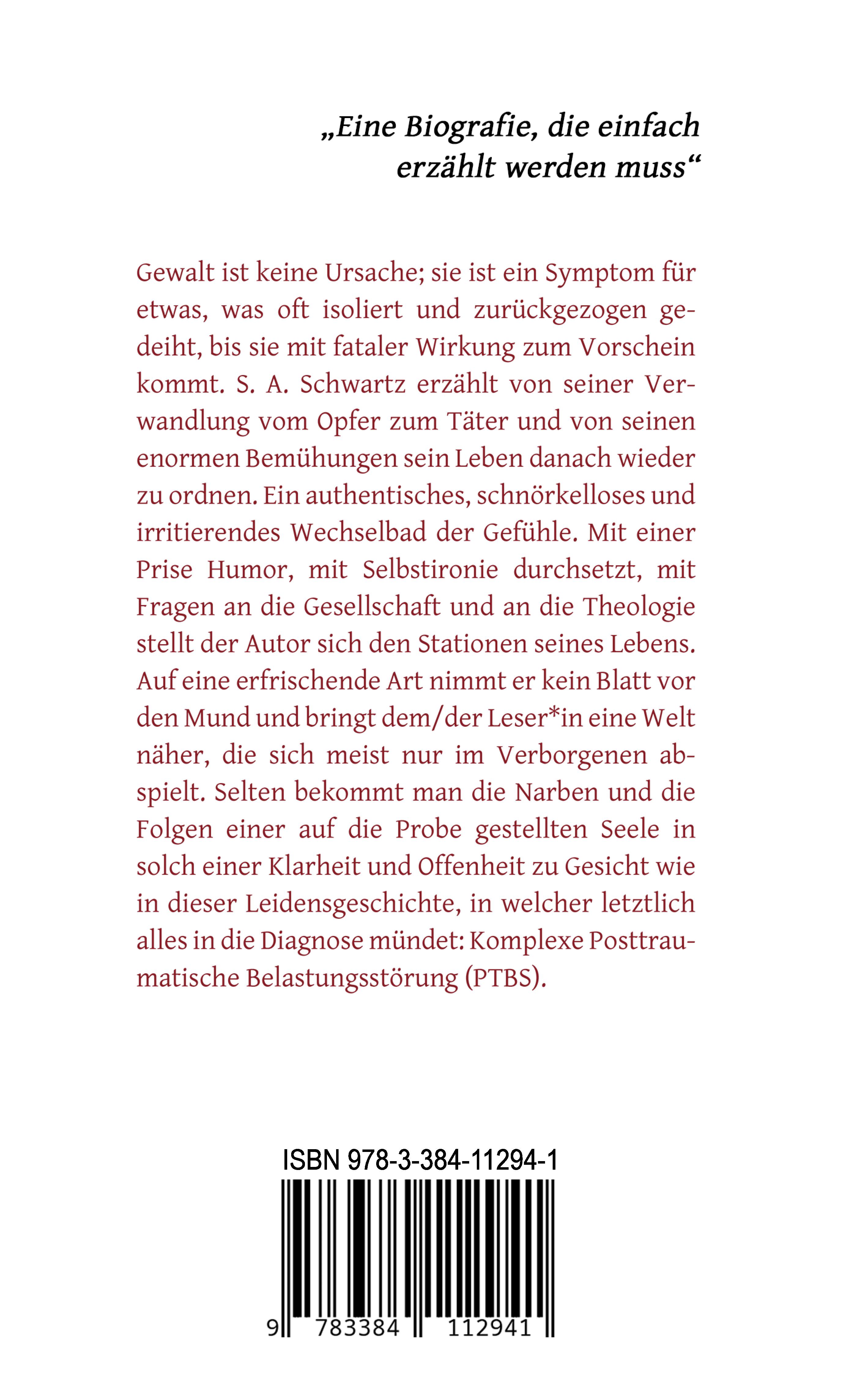 S. A. Schwartz ist 1977 in der deutschsprachigen Schweiz zur Welt gekommen. Der Autor wurde früh in seinem Leben mit Ausgrenzung, Mobbing, Gewalt, Kriminalität, Suiziden, mit Pflegefamilien, einem Jugendheim und dem Gefängnis konfrontiert. Als Folge auf die Misshandlungen wurde bei ihm eine komplexe posttraumatische Belastungsstörung und eine dissoziative Identitätsstörung diagnostiziert. Trotz allen Widerwertigkeiten hat er Theologie studiert und hat einen beachtlichen Bildungsweg gemeistert, bevor ihn seine Krankheit dazu zwang, sich neu im Leben auszurichten. Schreiben gehört seit Kindesbeinen zu seinem Mittel Unausgesprochenes auszusprechen und Unfassbares fassbar zu machen. Heute ist S. A. Schwartz verheiratet und lebt mit vier Hunden unter einem Dach.