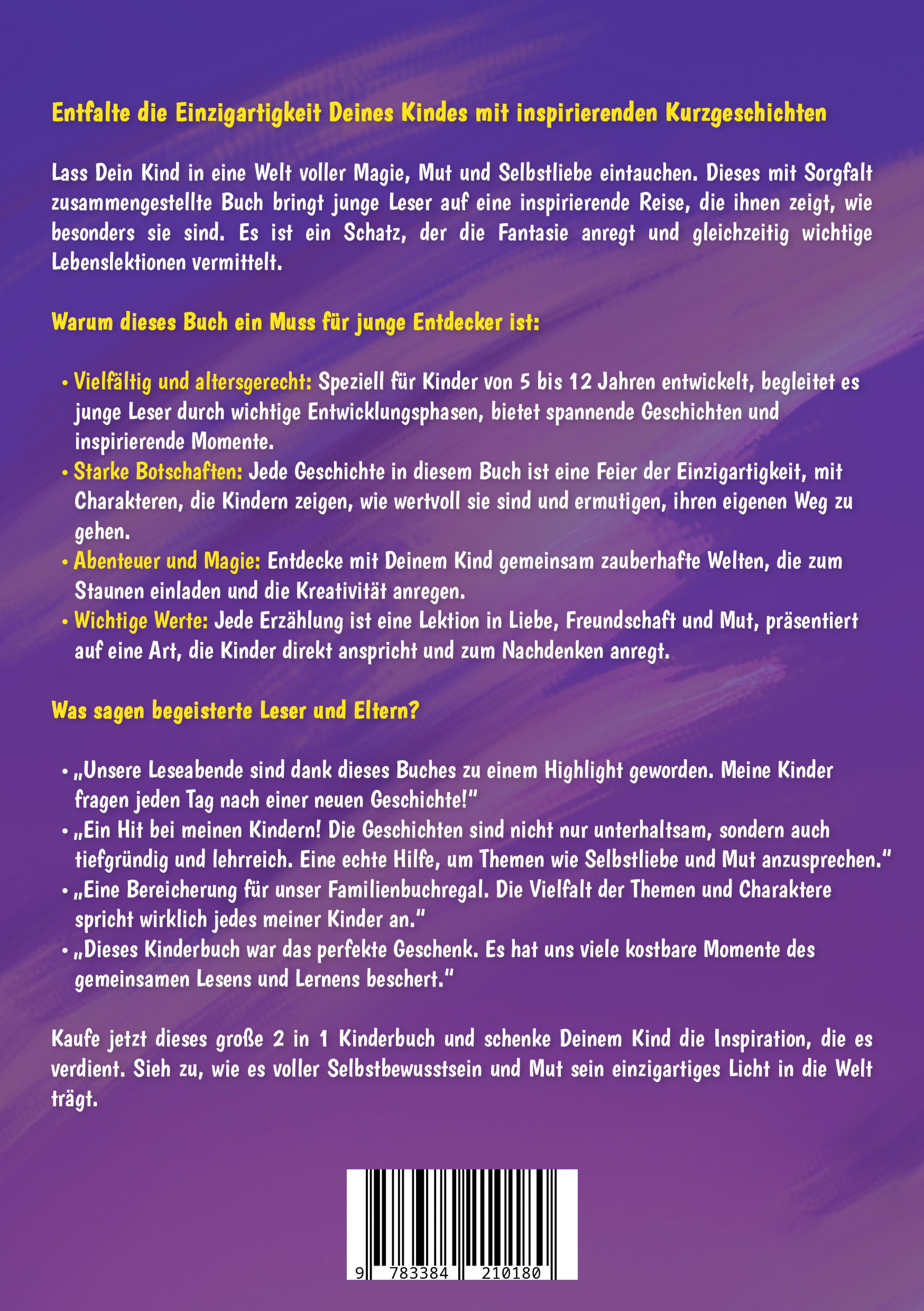 Entfalte die Einzigartigkeit Deines Kindes mit inspirierenden KurzgeschichtenLass Dein Kind in eine Welt voller Magie, Mut und Selbstliebe eintauchen. Dieses mit Sorgfalt zusammengestellte Buch bringt junge Leser auf eine inspirierende Reise, die ihnen zeigt, wie besonders sie sind. Es ist ein Schatz, der die Fantasie anregt und gleichzeitig wichtige Lebenslektionen vermittelt.Warum dieses Buch ein Muss für junge Entdecker ist:- Vielfältig und altersgerecht: Speziell für Kinder von 5 bis 12 Jahren entwickelt, begleitet es junge Leser durch wichtige Entwicklungsphasen, bietet spannende Geschichten und inspirierende Momente.- Starke Botschaften: Jede Geschichte in diesem Buch ist eine Feier der Einzigartigkeit, mit Charakteren, die Kindern zeigen, wie wertvoll sie sind und ermutigen, ihren eigenen Weg zu gehen.- Abenteuer und Magie: Entdecke mit Deinem Kind gemeinsam zauberhafte Welten, die zum Staunen einladen und die Kreativität anregen.- Wichtige Werte: Jede Erzählung ist eine Lektion in Liebe, Freundschaft und Mut, präsentiert auf eine Art, die Kinder direkt anspricht und zum Nachdenken anregt.Was sagen begeisterte Leser und Eltern?- "Unsere Leseabende sind dank dieses Buches zu einem Highlight geworden. Meine Kinder fragen jeden Tag nach einer neuen Geschichte!"- "Ein Hit bei meinen Kindern! Die Geschichten sind nicht nur unterhaltsam, sondern auch tiefgründig und lehrreich. Eine echte Hilfe, um Themen wie Selbstliebe und Mut anzusprechen."- "Eine Bereicherung für unser Familienbuchregal. Die Vielfalt der Themen und Charaktere spricht wirklich jedes meiner Kinder an."- "Dieses Kinderbuch war das perfekte Geschenk. Es hat uns viele kostbare Momente des gemeinsamen Lesens und Lernens beschert."Kaufe jetzt dieses große 2 in 1 Kinderbuch und schenke Deinem Kind die Inspiration, die es verdient. Sieh zu, wie es voller Selbstbewusstsein und Mut sein einzigartiges Licht in die Welt trägt.