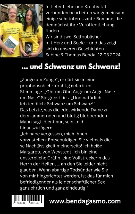 In tiefer Liebe und Kreativität verbunden bearbeiten wir gemeinsam einige sehr interessante Romane, die demnächst ihre Veröffentlichung finden. Wir sind zwei leidenschaftliche Selfpublisher mit Herz und Seele – und das zeigt sich in unseren Geschichten. Sabine & Thomas Benda, 2024 Besuchen Sie unsere Homepage: www.bendagasmo.com www.bendagasmo.com Besuchen Sie unsere Facebook-Büchergruppe: Alles zum Thema Buch https://www.facebook.com/groups/724981905219912