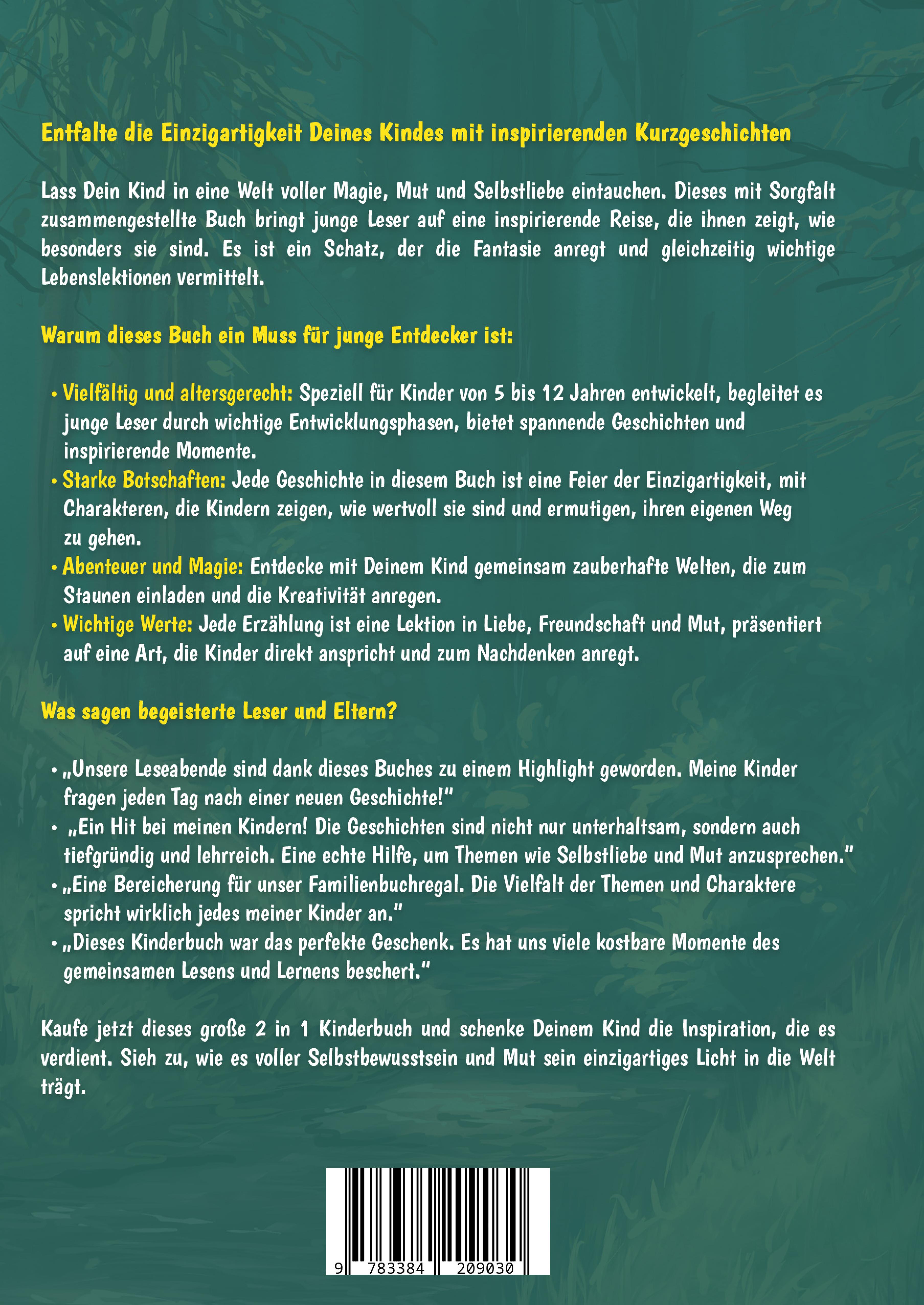 Entfalte die Einzigartigkeit Deines Kindes mit inspirierenden KurzgeschichtenLass Dein Kind in eine Welt voller Magie, Mut und Selbstliebe eintauchen. Dieses mit Sorgfalt zusammengestellte Buch bringt junge Leser auf eine inspirierende Reise, die ihnen zeigt, wie besonders sie sind. Es ist ein Schatz, der die Fantasie anregt und gleichzeitig wichtige Lebenslektionen vermittelt.Warum dieses Buch ein Muss für junge Entdecker ist:- Vielfältig und altersgerecht: Speziell für Kinder von 5 bis 12 Jahren entwickelt, begleitet es junge Leser durch wichtige Entwicklungsphasen, bietet spannende Geschichten und inspirierende Momente.- Starke Botschaften: Jede Geschichte in diesem Buch ist eine Feier der Einzigartigkeit, mit Charakteren, die Kindern zeigen, wie wertvoll sie sind und ermutigen, ihren eigenen Weg zu gehen.- Abenteuer und Magie: Entdecke mit Deinem Kind gemeinsam zauberhafte Welten, die zum Staunen einladen und die Kreativität anregen.- Wichtige Werte: Jede Erzählung ist eine Lektion in Liebe, Freundschaft und Mut, präsentiert auf eine Art, die Kinder direkt anspricht und zum Nachdenken anregt.Was sagen begeisterte Leser und Eltern?- "Unsere Leseabende sind dank dieses Buches zu einem Highlight geworden. Meine Kinder fragen jeden Tag nach einer neuen Geschichte!"- "Ein Hit bei meinen Kindern! Die Geschichten sind nicht nur unterhaltsam, sondern auch tiefgründig und lehrreich. Eine echte Hilfe, um Themen wie Selbstliebe und Mut anzusprechen."- "Eine Bereicherung für unser Familienbuchregal. Die Vielfalt der Themen und Charaktere spricht wirklich jedes meiner Kinder an."- "Dieses Kinderbuch war das perfekte Geschenk. Es hat uns viele kostbare Momente des gemeinsamen Lesens und Lernens beschert."Kaufe jetzt dieses große 2 in 1 Kinderbuch und schenke Deinem Kind die Inspiration, die es verdient. Sieh zu, wie es voller Selbstbewusstsein und Mut sein einzigartiges Licht in die Welt trägt.