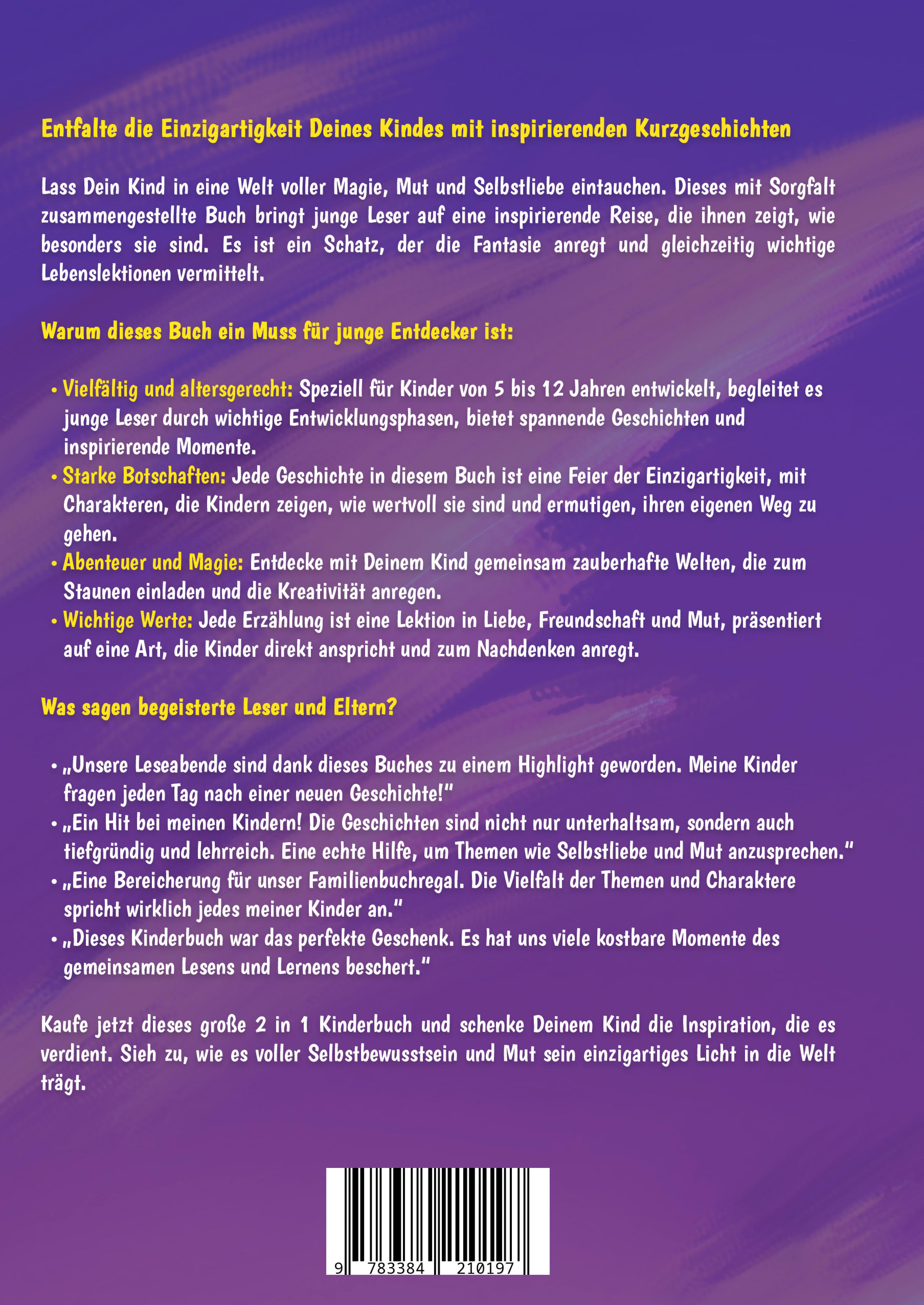 Entfalte die Einzigartigkeit Deines Kindes mit inspirierenden KurzgeschichtenLass Dein Kind in eine Welt voller Magie, Mut und Selbstliebe eintauchen. Dieses mit Sorgfalt zusammengestellte Buch bringt junge Leser auf eine inspirierende Reise, die ihnen zeigt, wie besonders sie sind. Es ist ein Schatz, der die Fantasie anregt und gleichzeitig wichtige Lebenslektionen vermittelt.Warum dieses Buch ein Muss für junge Entdecker ist:- Vielfältig und altersgerecht: Speziell für Kinder von 5 bis 12 Jahren entwickelt, begleitet es junge Leser durch wichtige Entwicklungsphasen, bietet spannende Geschichten und inspirierende Momente.- Starke Botschaften: Jede Geschichte in diesem Buch ist eine Feier der Einzigartigkeit, mit Charakteren, die Kindern zeigen, wie wertvoll sie sind und ermutigen, ihren eigenen Weg zu gehen.- Abenteuer und Magie: Entdecke mit Deinem Kind gemeinsam zauberhafte Welten, die zum Staunen einladen und die Kreativität anregen.- Wichtige Werte: Jede Erzählung ist eine Lektion in Liebe, Freundschaft und Mut, präsentiert auf eine Art, die Kinder direkt anspricht und zum Nachdenken anregt.Was sagen begeisterte Leser und Eltern?- "Unsere Leseabende sind dank dieses Buches zu einem Highlight geworden. Meine Kinder fragen jeden Tag nach einer neuen Geschichte!"- "Ein Hit bei meinen Kindern! Die Geschichten sind nicht nur unterhaltsam, sondern auch tiefgründig und lehrreich. Eine echte Hilfe, um Themen wie Selbstliebe und Mut anzusprechen."- "Eine Bereicherung für unser Familienbuchregal. Die Vielfalt der Themen und Charaktere spricht wirklich jedes meiner Kinder an."- "Dieses Kinderbuch war das perfekte Geschenk. Es hat uns viele kostbare Momente des gemeinsamen Lesens und Lernens beschert."Kaufe jetzt dieses große 2 in 1 Kinderbuch und schenke Deinem Kind die Inspiration, die es verdient. Sieh zu, wie es voller Selbstbewusstsein und Mut sein einzigartiges Licht in die Welt trägt.