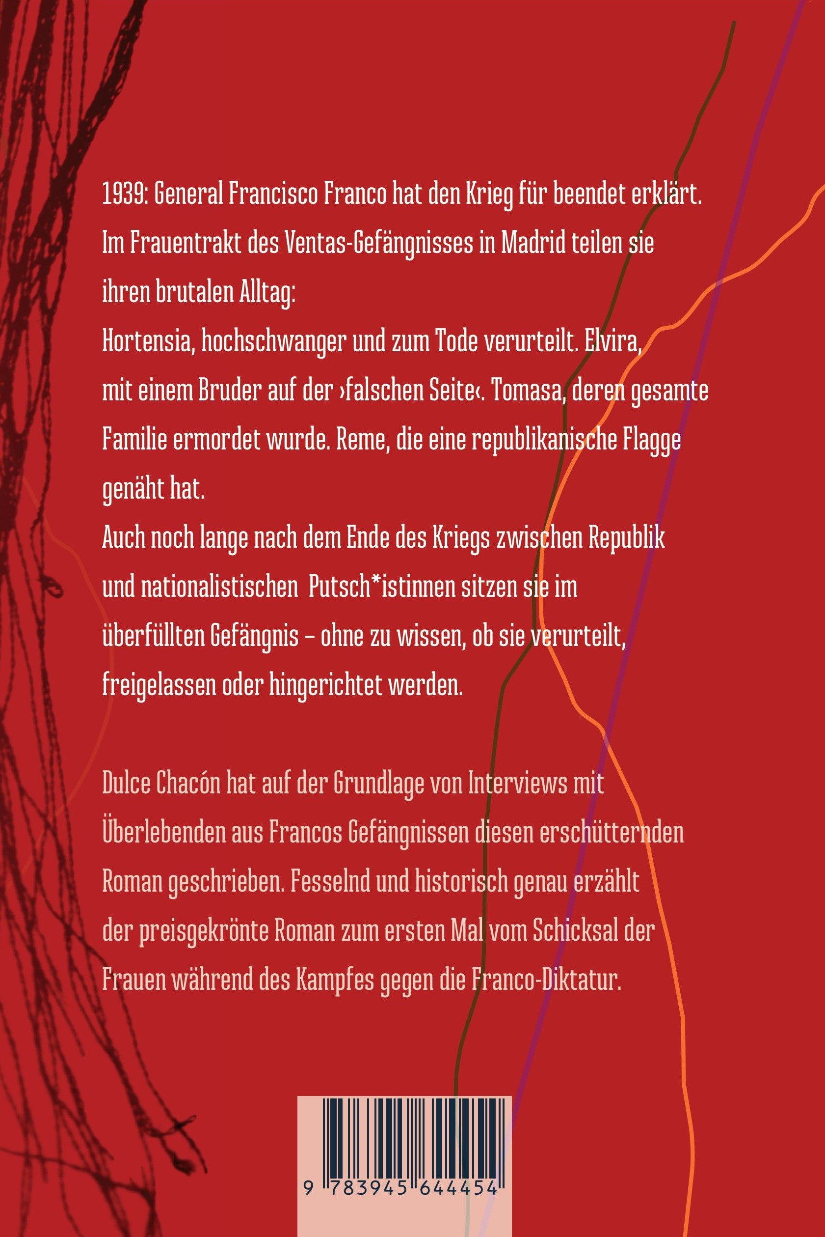 Dulce Chacón hat auf der Grundlage zahlreicher Interviews mit überlebenden Frauen aus den Gefängnissen der Franco-Diktatur in Spanien und deren Angehörigen diesen ergreifenden Roman über Frauen im Widerstand und in den Fängen der Franco-Diktatur geschrieben. Der historisch genaue Roman erzählt fesselnd die weibliche Geschichte unter der Franco-Diktatur. Eine Geschichte, die es bisher noch nicht zu lesen gab.