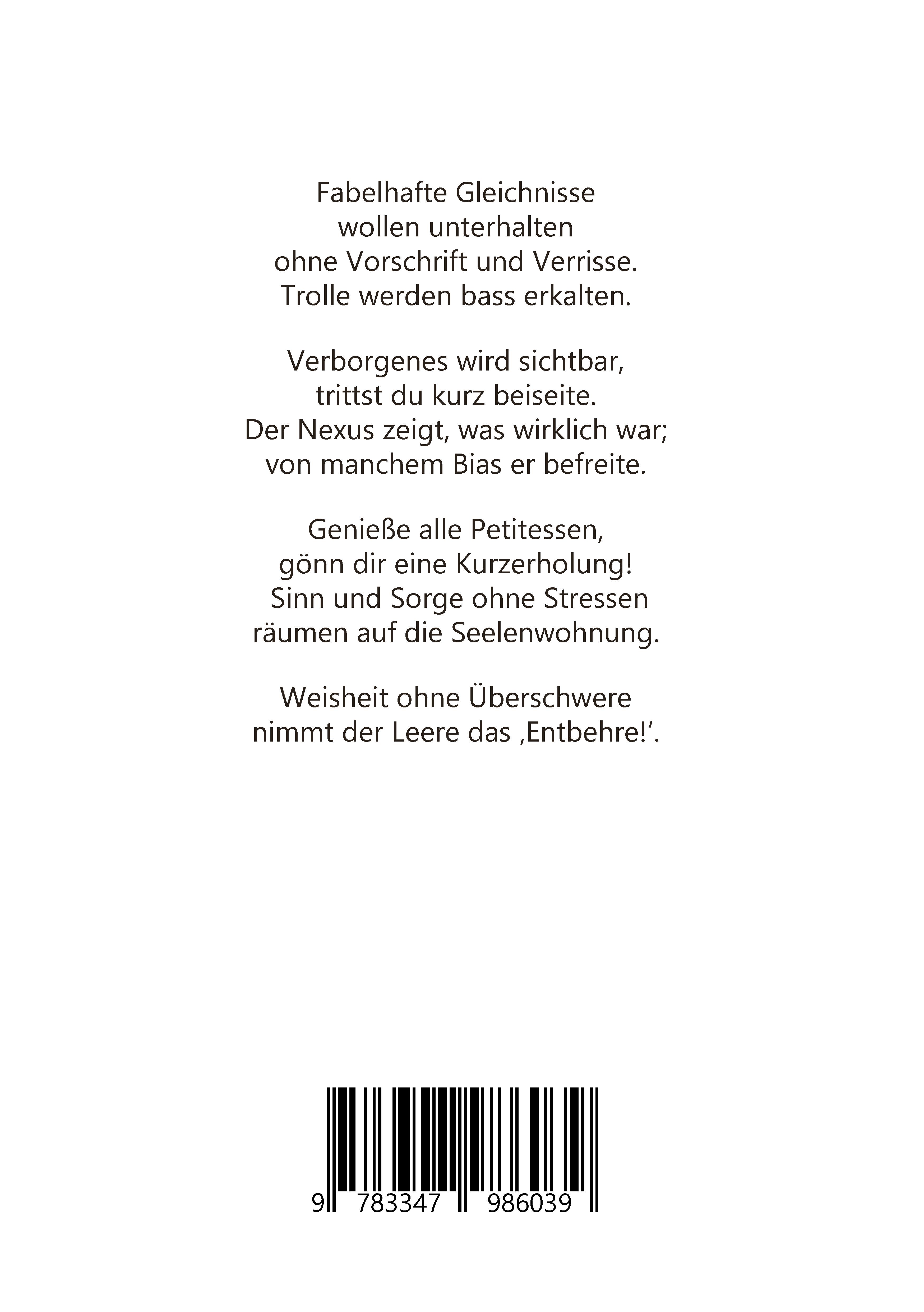Philosophische Gedichte mit bunter Thematik in heiterem Tiefgang warten darauf, entdeckt und entschlüsselt zu werden. Die klassische Versform erleichtert dies sehr.