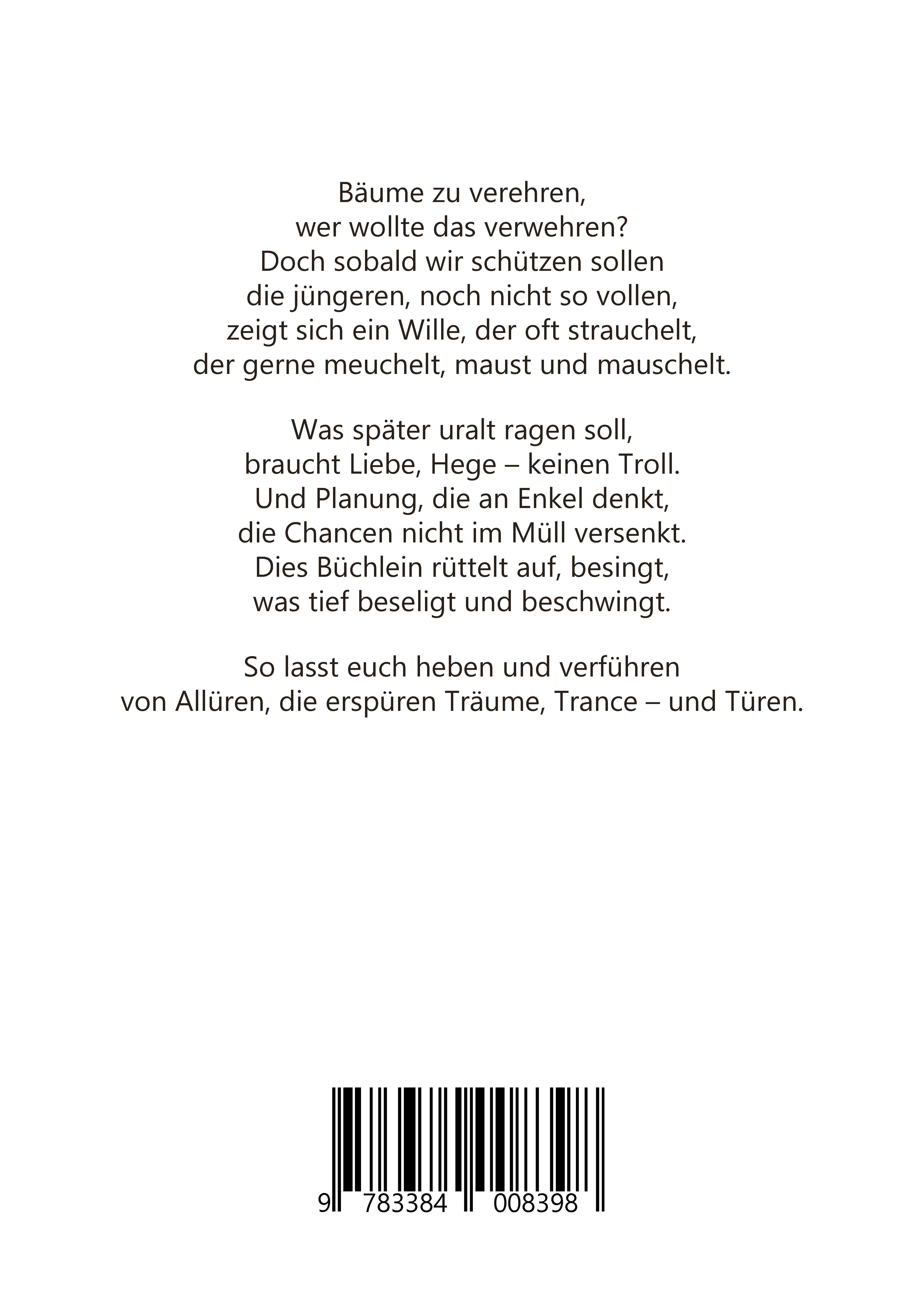 Hymnen auf die ältesten Freunde der Menschheit: Wie sehr uns doch Bäume inspirieren können! Gerade die alten. Die uralten Riesen! Dies Büchlein möchte sensibilisieren. Auf dass nicht umgerissen, abgehackt, verbrannt, vergiftet wird, was uns beschirmt, beschützt und inspiriert.