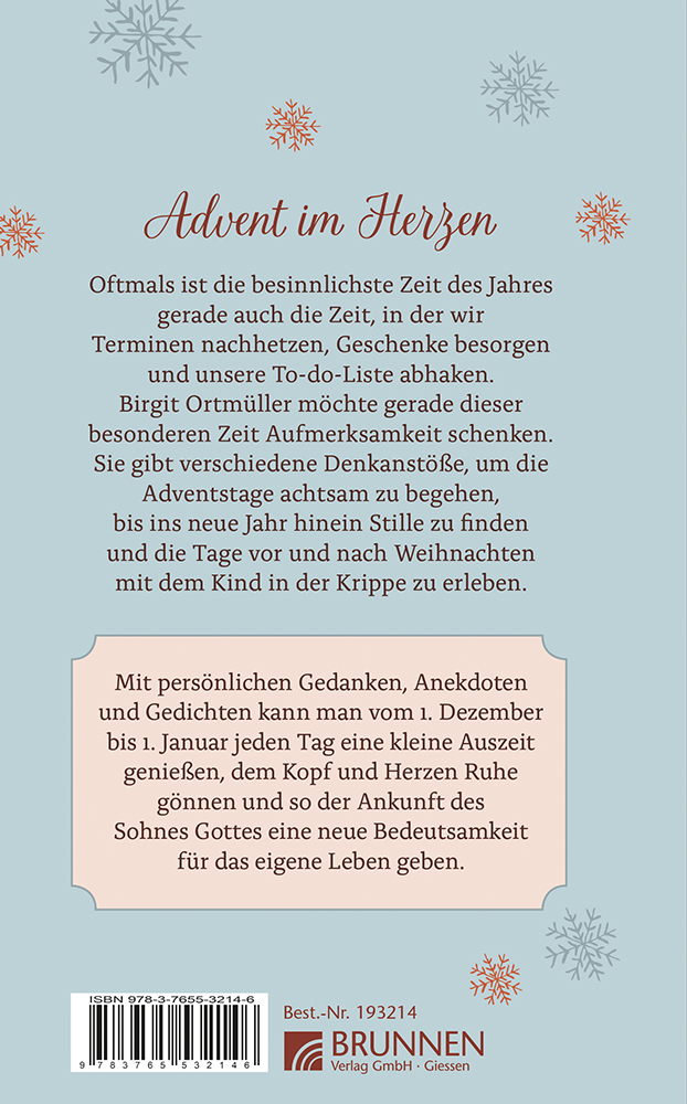 Das neue Buch von Birgit Ortmüller mit 32 Andachten und Impulsen im Advent ist ein achtsamer Begleiter durch die Weihnachtszeit und bis ins neue Jahr für mehr Ruhe, Besinnlichkeit und Entspannung in der schönsten Zeit des Jahres.