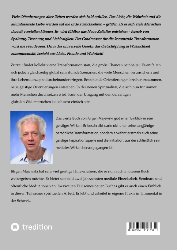 Jürgen Majewski ist Seminarleiter, spirituelles Medium, Heiler und Buchautor. Seine langjährige Erfahrung mit geistigen Wegen und Lehrern gibt er seit vielen Jahren in Einzelarbeit mit von ihm entwickelten Methoden in eigener Praxis weiter. Er bietet mediale Lebensberatung, Reinkarnations- Therapie, Energie- und Lichtarbeit für den gesamten deutschsprachigen Raum an. Die inneren Botschaften, die er empfängt, gibt er über das Internet und in seinen Büchern weiter. Jürgen Majewski stammt ursprünglich aus Norddeutschland; er lebt und arbeitet im Emmental in der Schweiz. Er ist Vater von zwei erwachsenen Töchtern. Seine bisherigen Bücher - "Die Welt im Wandel" und "Die Überwindung des Karmas" - sind im Reichel Verlag erschienen; "Die Vollendung des Regenbogens" ist im tredition- Verlag veröffentlicht worden.