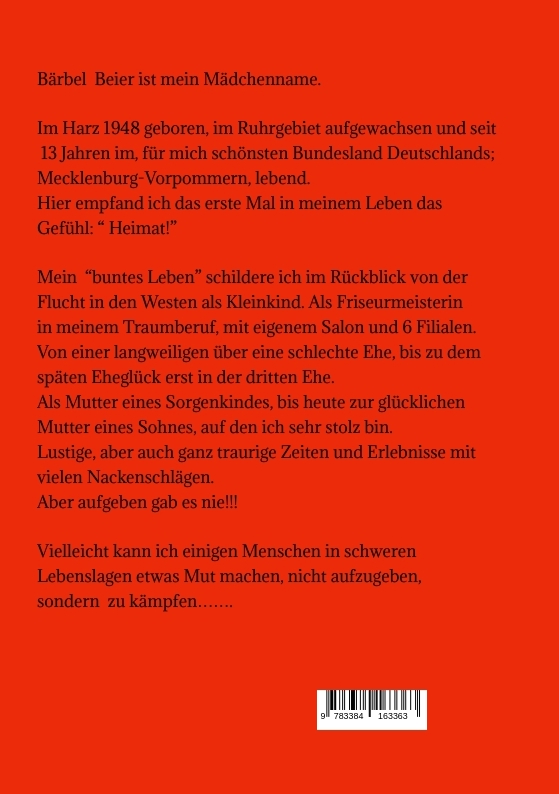 Bärbel Beier ist keine Schriftstellerin, sondern Friseurmeisterin und hatte einen eigenen Salon und mehrere Filialen. In ihrem Leben hat sie so viel erlebt, dass sie immer den Wunsch hatte, alles im Alter einmal zu einem Buch zu verarbeiten. Nach ihrem 75sten Geburtstag war es dann so weit. Sie ließ über 40 Bekannte und Verwandte den ersten Entwurf Probe lesen. Die Resonanz war so überwältigend, dass sie beschloss, ihr Buch zu veröffentlichen und dadurch auch anderen Menschen, in der Hoffnung ihnen auch ein paar schöne Lesestunden zu vermitteln, zur Verfügung zu stellen.