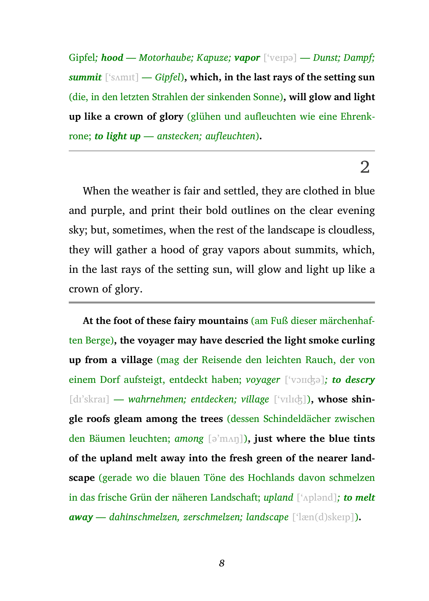 Entdecken Sie die Welt der Fremdsprachen auf eine ganz neue Weise mit der Lesemethode von Ilya Frank, perfekt für alle ab dem Sprachniveau A2. Diese innovative Methode kombiniert Originaltexte mit klaren, direkten Übersetzungen und bietet zusätzliche Erläuterungen direkt im Lesefluss, um ein tiefes Verständnis und schnelles Lernen zu fördern. Ob Sie Ihre Sprachkenntnisse verbessern oder in eine neue Sprache eintauchen möchten, diese Methode bietet ein einzigartiges und effektives Leseerlebnis. Dank der integrierten Hörbücher wird auch das Hörverständnis trainiert.Lesemethode von Ilya Frank ist ideal für alle, die ihre Sprachkenntnisse effektiv erweitern wollen, ohne den natürlichen Lesefluss zu unterbrechen.Tauchen Sie ein in Washington Irvings "Rip Van Winkle", eine fesselnde Erzählung, die in den malerischen Kulissen der Kaatskill-Berge spielt. Diese zeitlose Geschichte entführt den Leser in eine Welt voller Wunder, in der Rip, ein einfacher Mann aus einem kleinen Dorf, sich auf eine unerwartete Reise begibt, die das Wesen der Zeit und des Wandels erforscht. Irvings meisterhafte Erzählung, reich an Folklore und amerikanischer Geschichte, webt ein magisches Netz, das den Leser von der ersten Seite an in seinen Bann zieht. Entdecken Sie die Schönheit und die Rätsel der Natur, die Kraft der Tradition und die unerwarteten Wege, auf denen sich das Leben entfalten kann. "Rip Van Winkle" ist nicht nur eine Geschichte über einen langen Schlaf, sondern eine tiefgreifende Reflexion über die menschliche Erfahrung, die den Leser lange nach dem Umblättern der letzten Seite begleitet.Ungekürzter Originaltext. Zweisprachiges Buch Englisch-Deutsch.Innovative Lesemethode von Ilya Frank: https://easyoriginal.com/lesemethode/ Leseprobe: https://easyoriginal.com/leseproben/DE54.pdf