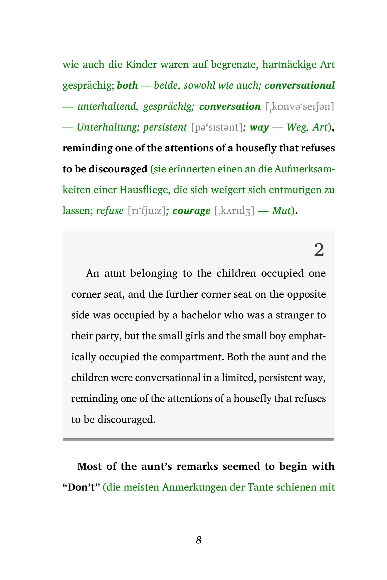 Entdecken Sie die Welt der Fremdsprachen auf eine ganz neue Weise mit der Lesemethode von Ilya Frank, perfekt für alle ab dem Sprachniveau A2. Diese innovative Methode kombiniert Originaltexte mit klaren, direkten Übersetzungen und bietet zusätzliche Erläuterungen direkt im Lesefluss, um ein tiefes Verständnis und schnelles Lernen zu fördern. Ob Sie Ihre Sprachkenntnisse verbessern oder in eine neue Sprache eintauchen möchten, diese Methode bietet ein einzigartiges und effektives Leseerlebnis. Dank der integrierten Hörbücher wird auch das Hörverständnis trainiert.Lesemethode von Ilya Frank ist ideal für alle, die ihre Sprachkenntnisse effektiv erweitern wollen, ohne den natürlichen Lesefluss zu unterbrechen."Der Erzähler" von Saki ist eine meisterhaft erzählte Kurzgeschichte, die mit Witz und scharfsinniger Beobachtungsgabe glänzt. An einem heißen Nachmittag in einem Zugabteil entfaltet sich eine faszinierende Begegnung zwischen einer Tante, ihren drei jungen Begleitern und einem mysteriösen Junggesellen. Während die Kinder von ihrer Tante unterhalten werden möchten, wird die Situation durch den Eintritt des Junggesellen in die Dynamik der Gruppe interessant und unvorhersehbar. Sakis Geschichte ist ein brillantes Beispiel für die Kunst des Geschichtenerzählens und bietet eine fesselnde Mischung aus Humor, Ironie und subtiler Gesellschaftskritik. Dieses Werk ist perfekt für Leser, die eine Geschichte mit Tiefe und Charakter suchen, die zugleich unterhaltsam und gedankenanregend ist. Ideal für diejenigen, die Freude an Geschichten finden, die sowohl zum Schmunzeln bringen als auch zum Nachdenken anregen, ohne dabei die üblichen Pfade des Erzählens zu beschreiten.Ungekürzter Originaltext. Zweisprachiges Buch Englisch-Deutsch. Innovative Lesemethode von Ilya Frank: https://easyoriginal.com/lesemethode/