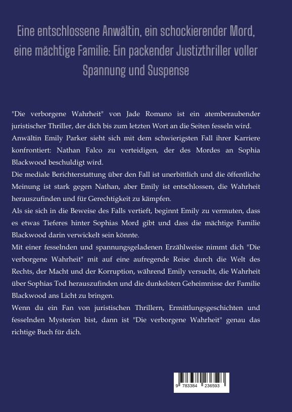 Jade Romano est une auteure émergente de la scène littéraire américaine, connue pour son style d'écriture captivant et palpitant. Née et élevée aux États-Unis, Jade a toujours eu une grande passion pour la lecture et l'écriture, depuis son enfance. Après avoir obtenu un diplôme de littérature anglaise, Jade a commencé à travailler comme journaliste, s'occupant de critiques de livres et d'interviews d'auteurs émergents. Mais sa véritable passion reste l'écriture, et c'est ainsi qu'elle décide de se consacrer à l'écriture d'histoires à suspense. Son premier livre, un roman à suspense intitulé "The Hidden Truth" (La vérité cachée), a été publié récemment et a connu un succès immédiat tant auprès du public que de la critique. Le livre se caractérise par une intrigue captivante et surprenante, ainsi que par des personnages complexes et aux multiples facettes. Jade Romano est considérée comme l'un des auteurs les plus prometteurs de la scène américaine du thriller, et ses histoires sont appréciées par les lecteurs pour leur capacité à les garder collés aux pages jusqu'à la dernière ligne. Outre l'écriture, Jade se consacre également à l'enseignement de l'écriture créative, organisant des cours et des ateliers pour les écrivains en herbe. Son écriture, caractérisée par un style fluide et captivant, est capable de créer des atmosphères sombres et inquiétantes, mais aussi de donner des moments de grande tension et de suspense. Bien qu'elle n'en soit qu'au début de sa carrière, Jade Romano a déjà démontré qu'elle avait un grand talent et une grande passion pour l'écriture, et nous sommes sûrs que nous entendrons beaucoup parler d'elle à l'avenir.
