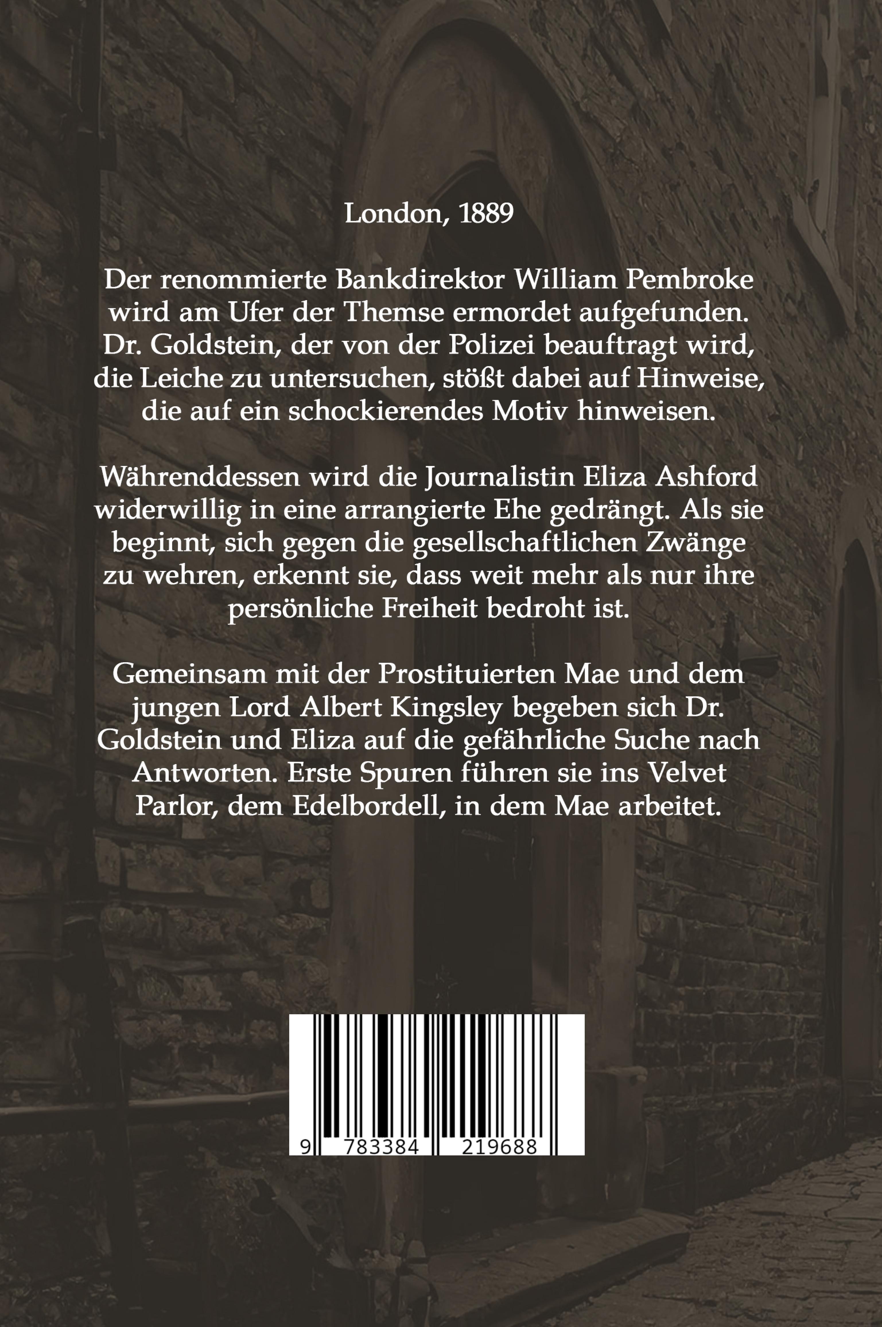 London, 1889 Der renommierte Bankdirektor William Pembroke wird am Ufer der Themse ermordet aufgefunden. Dr. Goldstein, der von der Polizei beauftragt wird, die Leiche zu untersuchen, stößt dabei auf Hinweise, die auf ein schockierendes Motiv hinweisen.Währenddessen wird die Journalistin Eliza Ashford widerwillig in eine arrangierte Ehe gedrängt. Als sie beginnt, sich gegen die gesellschaftlichen Zwänge zu wehren, erkennt sie, dass weit mehr als nur ihre persönliche Freiheit bedroht ist.Gemeinsam mit der Prostituierten Mae und dem jungen Lord Albert Kingsley begeben sich Dr. Goldstein und Eliza auf die gefährliche Suche nach Antworten. Erste Spuren führen sie ins Velvet Parlor, dem Edelbordell, in dem Mae arbeitet.