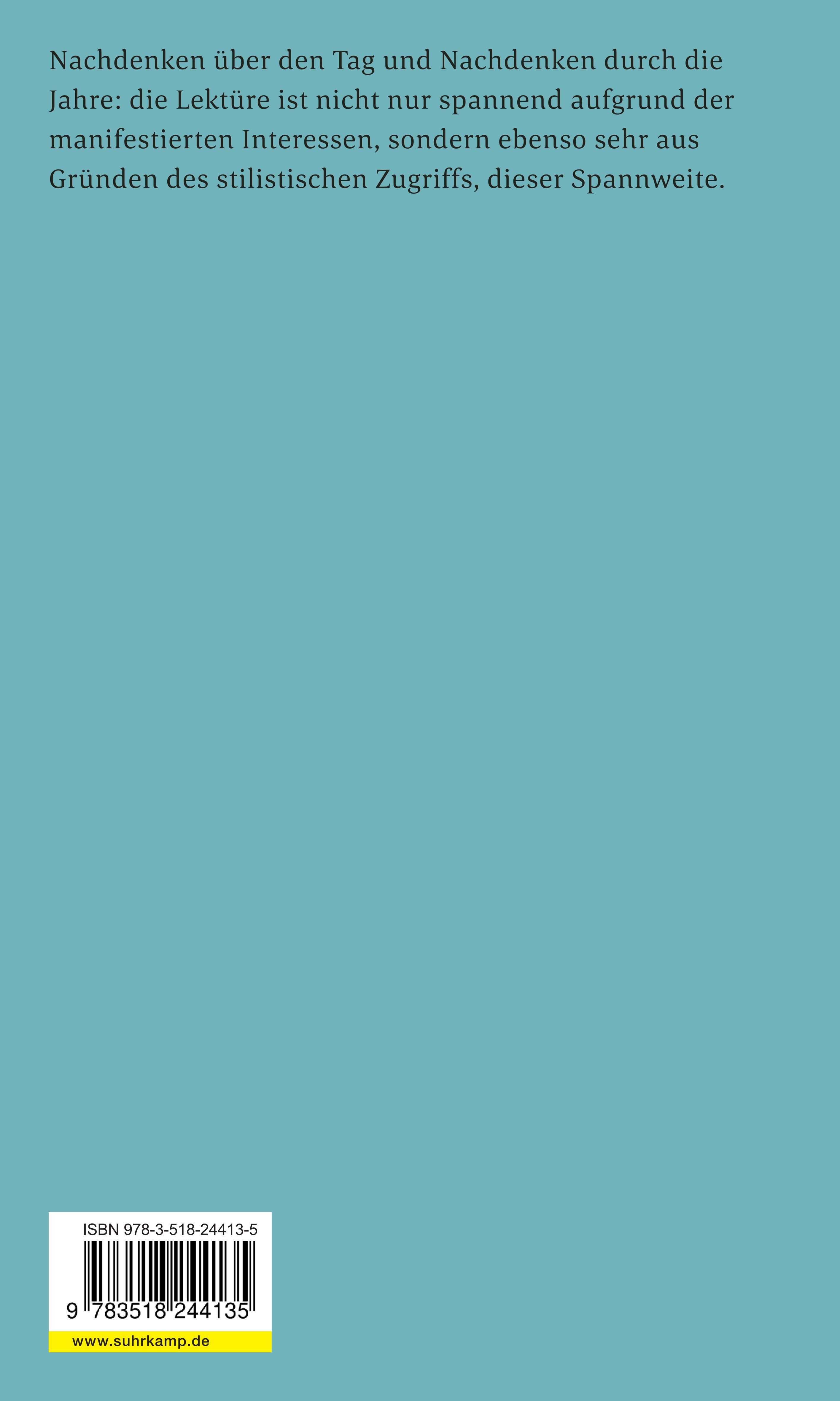 Unter dem Titel Über den Tag und durch die Jahre werden Texte aus einem Zeitraum von drei Jahrzehnten vorgelegt, die insofern zusammengehören, als sie das Nachdenken üben und belegen und zwar in allen möglichen Spielarten, von der spontanen Überlegung bis zur ausgewachsenen Untersuchung. Gegenstand des Nachdenkens können Lektüren, Ausstellungs- und Kinobesuch sein, aber auch weniger kulturelle Angebote wie die Zigarette, die Silvesterfeier, das Sexplakat. Die andere Lebensweise, die andere Kultur kommen in einem römischen Brief, einer Depesche aus New York, einem Exkurs über die französische Frau und in einem Bericht über das Zusammenleben mit Schwarzafrikanern in Paris zur Sprache. Das gründlichste Nachdenken besorgen die Essays über Dichter- und Künstlerpersönlichkeiten, die den Verfasser angesteckt und mit Kriterien ausgerüstet haben. Der den Band abschließende »Versuch über das Sehen« ist unverhohlen in eigener Sache geschrieben und als bekenntnishaftes Dichtungsprogramm aufzufassen.