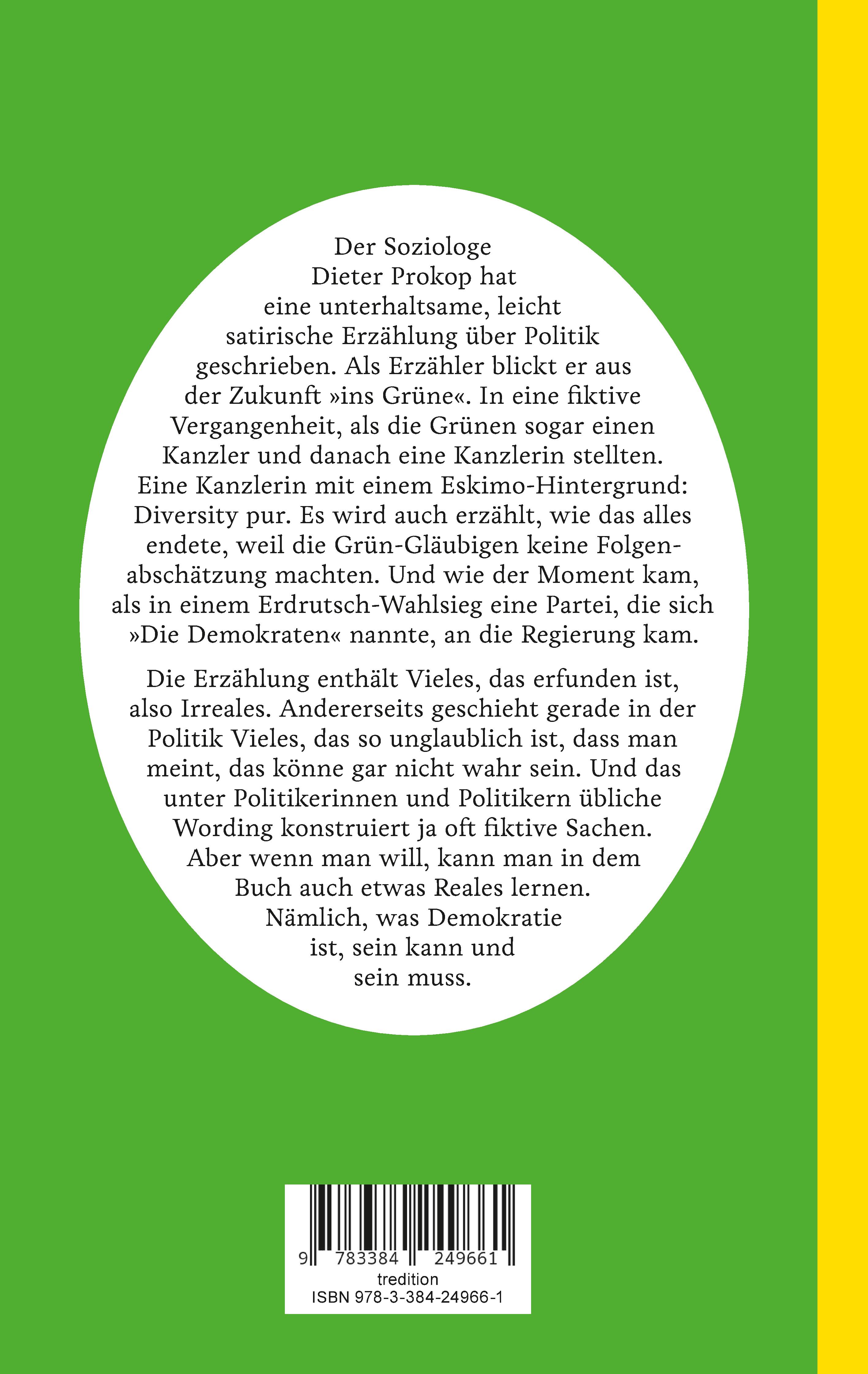 Der Soziologe Dieter Prokop hat eine unterhaltsame, leicht satirische Erzählung über Politik geschrieben. Als Erzähler blickt er aus der Zukunft »ins Grüne«. In eine fiktive Vergangenheit, als die Grünen sogar einen Kanzler und danach eine Kanzlerin stellten. Eine Kanzlerin mit einem Eskimo-Hintergrund: Diversity pur. Es wird auch erzählt, wie das alles endete, weil die Grün-Gläubigen keine Folgenabschätzung machten. Und wie der Moment kam, als in einem Erdrutsch-Wahlsieg eine Partei, die sich »Die Demokraten« nannte, an die Regierung kam.Die Erzählung enthält Vieles, das erfunden ist, also Irreales. Andererseits geschieht gerade in der Politik Vieles, das so unglaublich ist, dass man meint, das könne gar nicht wahr sein. Und das unter Politikerinnen und Politikern übliche Wording konstruiert ja oft fiktive Sachen. Aber wenn man will, kann man in dem Buch auch etwas Reales lernen. Nämlich, was Demokratie ist, sein kann und sein muss.