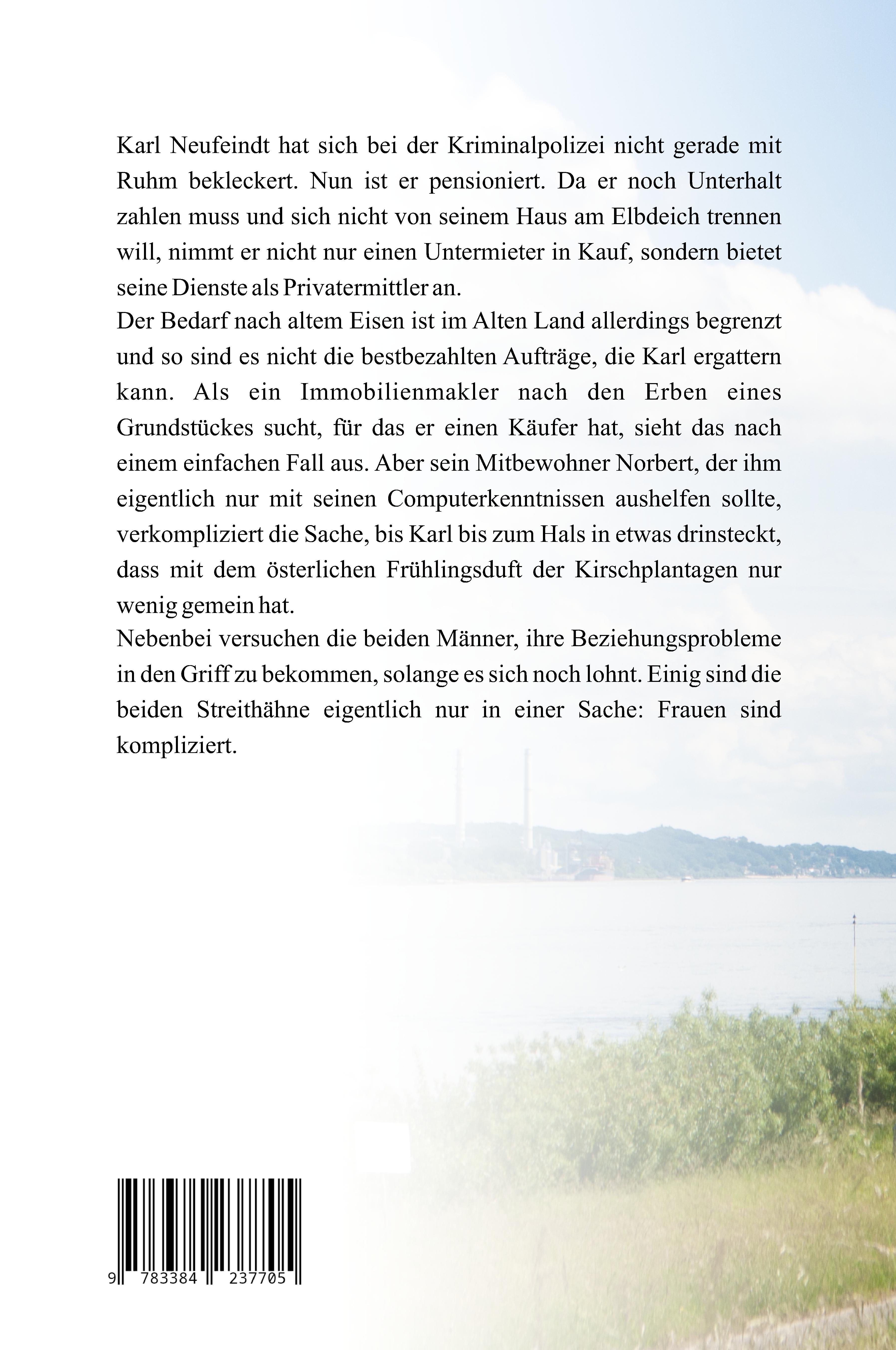 Karl Neufeindt hat sich bei der Kriminalpolizei nicht gerade mit Ruhm bekleckert. Nun ist er pensioniert und lebt im Alten Land vor den Toren Hamburgs zwischen Kirschen und Äpfeln Da er noch Unterhalt zahlen muss und sich nicht von seinem Haus am Elbdeich trennen will, nimmt er nicht nur einen Untermieter in Kauf, sondern bietet seine Dienste als Privatermittler an. Der Bedarf nach altem Eisen ist im Alten Land allerdings begrenzt und so sind es nicht die bestbezahlten Aufträge, die Karl ergattern kann. Als ein Immobilienmakler nach den Erben eines Grundstückes sucht, für das er einen Käufer hat, sieht das nach einem einfachen Fall aus. Aber sein Mitbewohner Norbert, der ihm eigentlich nur mit seinen Computerkenntnissen aushelfen sollte, verkompliziert die Sache, bis Karl bis zum Hals in etwas drinsteckt, dass mit dem österlichen Frühlingsduft der Kirschplantagen nur wenig gemein hat. Nebenbei versuchen die beiden Männer, ihre Beziehungsprobleme in den Griff zu bekommen, solange es sich noch lohnt. Einig sind die beiden Streithähne eigentlich nur in einer Sache: Frauen sind kompliziert. Ein gemütlicher Krimi mit norddeutschem Humor und viel Lokalkolorit aus dem Alten Land an der Elbe.