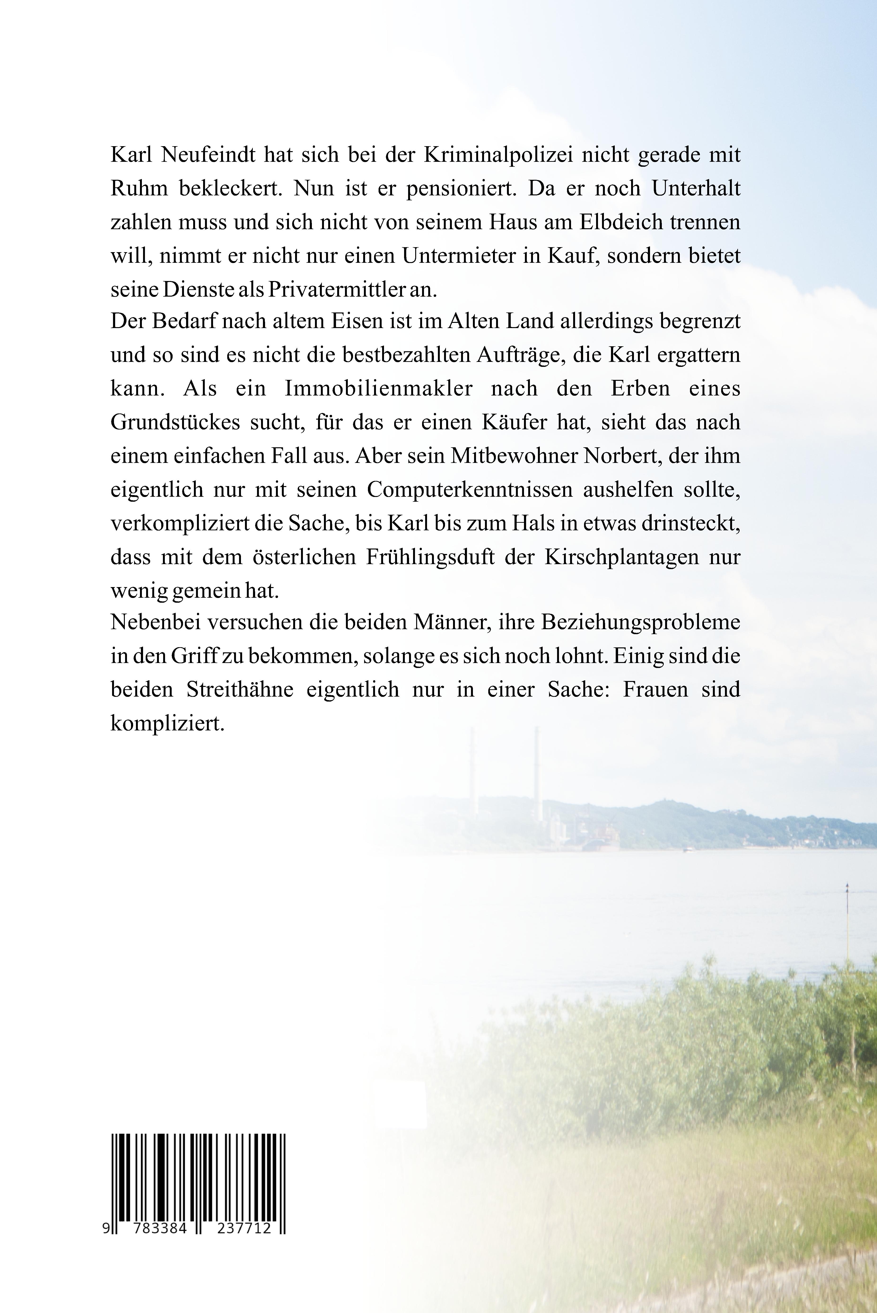Karl Neufeindt hat sich bei der Kriminalpolizei nicht gerade mit Ruhm bekleckert. Nun ist er pensioniert und lebt im Alten Land vor den Toren Hamburgs zwischen Kirschen und Äpfeln Da er noch Unterhalt zahlen muss und sich nicht von seinem Haus am Elbdeich trennen will, nimmt er nicht nur einen Untermieter in Kauf, sondern bietet seine Dienste als Privatermittler an. Der Bedarf nach altem Eisen ist im Alten Land allerdings begrenzt und so sind es nicht die bestbezahlten Aufträge, die Karl ergattern kann. Als ein Immobilienmakler nach den Erben eines Grundstückes sucht, für das er einen Käufer hat, sieht das nach einem einfachen Fall aus. Aber sein Mitbewohner Norbert, der ihm eigentlich nur mit seinen Computerkenntnissen aushelfen sollte, verkompliziert die Sache, bis Karl bis zum Hals in etwas drinsteckt, dass mit dem österlichen Frühlingsduft der Kirschplantagen nur wenig gemein hat. Nebenbei versuchen die beiden Männer, ihre Beziehungsprobleme in den Griff zu bekommen, solange es sich noch lohnt. Einig sind die beiden Streithähne eigentlich nur in einer Sache: Frauen sind kompliziert. Ein gemütlicher Krimi mit norddeutschem Humor und viel Lokalkolorit aus dem Alten Land an der Elbe.