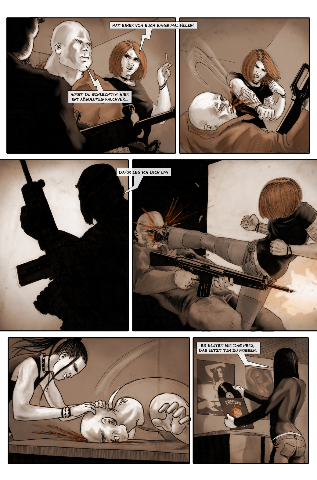 Postapokalypse in Deutschland. Hier geht es brutal zu. Michael Feldmann zeichnet eine schonungslose Welt mit Sex und Gewalt, in der seine Protagonisten agieren. Zwanzig Jahre weltweiter Krieg um die letzten Energiereserven haben weite Teile Europas verwüstet. Eine neue Mauer verläuft durch Deutschland. Auf der einen Seite der Mauer eine der letzten Wohlstandsgesellschaften – auf der anderen Seite die dritte Welt. Hier in der Welt der Armen, der sogenannten Quarantäne-Zone, leben Dodo und Nuke. Dodo, eine ehemalige Guerilla-Kämpferin ist, die Gitarristin der Metal-Band Iwo Jima Girls. Ein letztes großes Konzert in der Quarantäne-Zone soll der Band den Durchbruch bringen. Nuke, ein fahnenflüchtiger Kriegsveteran, hält sich mit Gelegenheitsjobs über Wasser und ertränkt den Frust über sein trostloses Leben in der Quarantäne-Zone mit zu viel Alkohol. Dies ist der chronologische Beginn der Hades-Syndrom Saga von Dodo und Nuke. Die in diesem Sammelband enthaltenen Geschichten "Der letzte Gig" und "Crossfire" erschienen erstmalig in den Jahren 2011 und 2013 und wurden grundlegend überarbeitet.