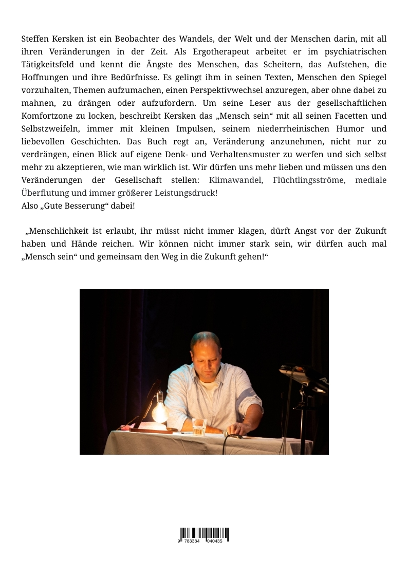 Steffen Kersken schreibt in seinen Büchern mit niederrheinischem Humor über das „Mensch sein“, und beschäftigt sich in unterschiedlichen Formen mit prägenden Begriffen wie: Liebe, Verantwortung, Perfektionismus, Erwartungshaltung, das Scheitern, Verletzung und Schmerz, Hoffnung, Verzeihen, Glück, Alter, Krankheit, Trauer, Geborgenheit, Bedürfnissen, schwach sein und vielen mehr! Der Literatur-Nachwuchspreisträger von 2003, Ergotherapeut einer Psychiatrie und ehemalige Handball-Jugendnationalspieler widmet sich in seiner niederrheinischen Art, mit Humor, kleinen Anekdoten aber auch mit nachdenklichen Texten, Reflexionen und Gedichten diesen lebensnahen Themen. Nicht selten gleitet eine humorvolle, lustige Anekdote in ein Gedicht oder gedankenvollen Prosatext über. Diesen besonderen Charme und die überraschenden Wendungen in seinen Texten lieben seine Zuschauer, besonders bei seinen beliebten modernen Musiklesungen, in denen er Lesung, Musik und Bild vereint. Der Ergotherapeut einer psychiatrischen Tagesklinik findet immer die richtige Mischung aus humorvollen Anekdoten und Lebensfreude, aber auch gesellschaftskritischen Themen, Politik und modernen Gesellschafts-erkrankungen, wie die Depression, Burnout oder Panikattacken. Kersken verbindet Texte über seine Heimat und dem Niederrheiner mit seinen liebevollen Macken und Eigenarten, mit den Veränderungen, Problemen und Themen dieser Zeit, wie Religions-Kriegen, Flüchtlings-Fluten, dem Leistungsdruck unserer schnelllebigen Gesellschaft und Erwartungshaltungen. Echte Werte, eigene Träume und menschliche Bedürfnisse gehen immer mehr verloren, aber wie finden wir uns in dieser Welt voller Problemen und unseren alltäglichen Herausforderungen noch selbst wieder, was sind unsere persönlichen Bedürfnisse, wie können wir uns individuell entfalten, persönlich weiterentwickeln, aber trotzdem noch allen gerecht werden oder gleichzeitig weltoffen Handeln, um an der Lösung für Probleme dieser Welt teilzuhaben? Bestseller sind seine Fachbücher für Ergotherapie in der Psychiatrie, sowie seine Sammler-Sonderformate "Dat is Heimat", in Großformat und Edelcover, mit Bildern von über 20 verschiedenen Malern, Fotografen & Künstlern des Niederrheins!