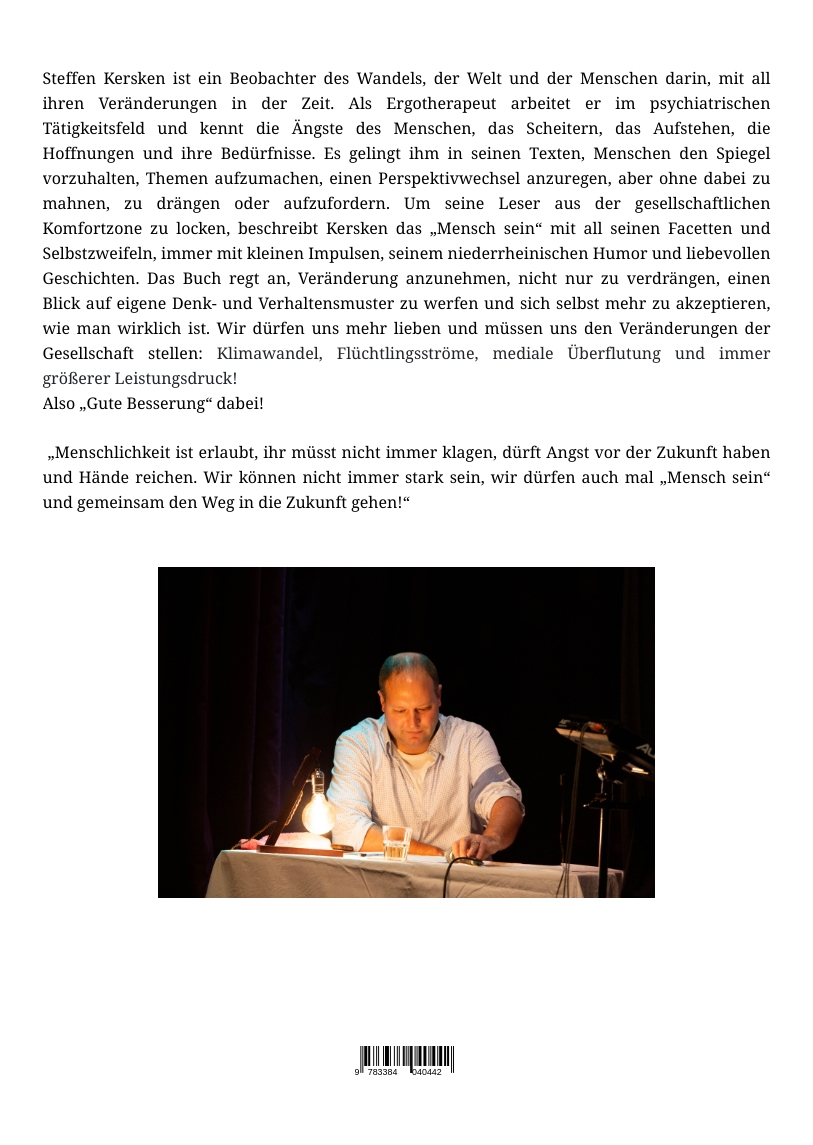 Steffen Kersken schreibt in seinen Büchern mit niederrheinischem Humor über das „Mensch sein“, und beschäftigt sich in unterschiedlichen Formen mit prägenden Begriffen wie: Liebe, Verantwortung, Perfektionismus, Erwartungshaltung, das Scheitern, Verletzung und Schmerz, Hoffnung, Verzeihen, Glück, Alter, Krankheit, Trauer, Geborgenheit, Bedürfnissen, schwach sein und vielen mehr! Der Literatur-Nachwuchspreisträger von 2003, Ergotherapeut einer Psychiatrie und ehemalige Handball-Jugendnationalspieler widmet sich in seiner niederrheinischen Art, mit Humor, kleinen Anekdoten aber auch mit nachdenklichen Texten, Reflexionen und Gedichten diesen lebensnahen Themen. Nicht selten gleitet eine humorvolle, lustige Anekdote in ein Gedicht oder gedankenvollen Prosatext über. Diesen besonderen Charme und die überraschenden Wendungen in seinen Texten lieben seine Zuschauer, besonders bei seinen beliebten modernen Musiklesungen, in denen er Lesung, Musik und Bild vereint. Der Ergotherapeut einer psychiatrischen Tagesklinik findet immer die richtige Mischung aus humorvollen Anekdoten und Lebensfreude, aber auch gesellschaftskritischen Themen, Politik und modernen Gesellschafts-erkrankungen, wie die Depression, Burnout oder Panikattacken. Kersken verbindet Texte über seine Heimat und dem Niederrheiner mit seinen liebevollen Macken und Eigenarten, mit den Veränderungen, Problemen und Themen dieser Zeit, wie Religions-Kriegen, Flüchtlings-Fluten, dem Leistungsdruck unserer schnelllebigen Gesellschaft und Erwartungshaltungen. Echte Werte, eigene Träume und menschliche Bedürfnisse gehen immer mehr verloren, aber wie finden wir uns in dieser Welt voller Problemen und unseren alltäglichen Herausforderungen noch selbst wieder, was sind unsere persönlichen Bedürfnisse, wie können wir uns individuell entfalten, persönlich weiterentwickeln, aber trotzdem noch allen gerecht werden oder gleichzeitig weltoffen Handeln, um an der Lösung für Probleme dieser Welt teilzuhaben? Bestseller sind seine Fachbücher für Ergotherapie in der Psychiatrie, sowie seine Sammler-Sonderformate "Dat is Heimat", in Großformat und Edelcover, mit Bildern von über 20 verschiedenen Malern, Fotografen & Künstlern des Niederrheins!