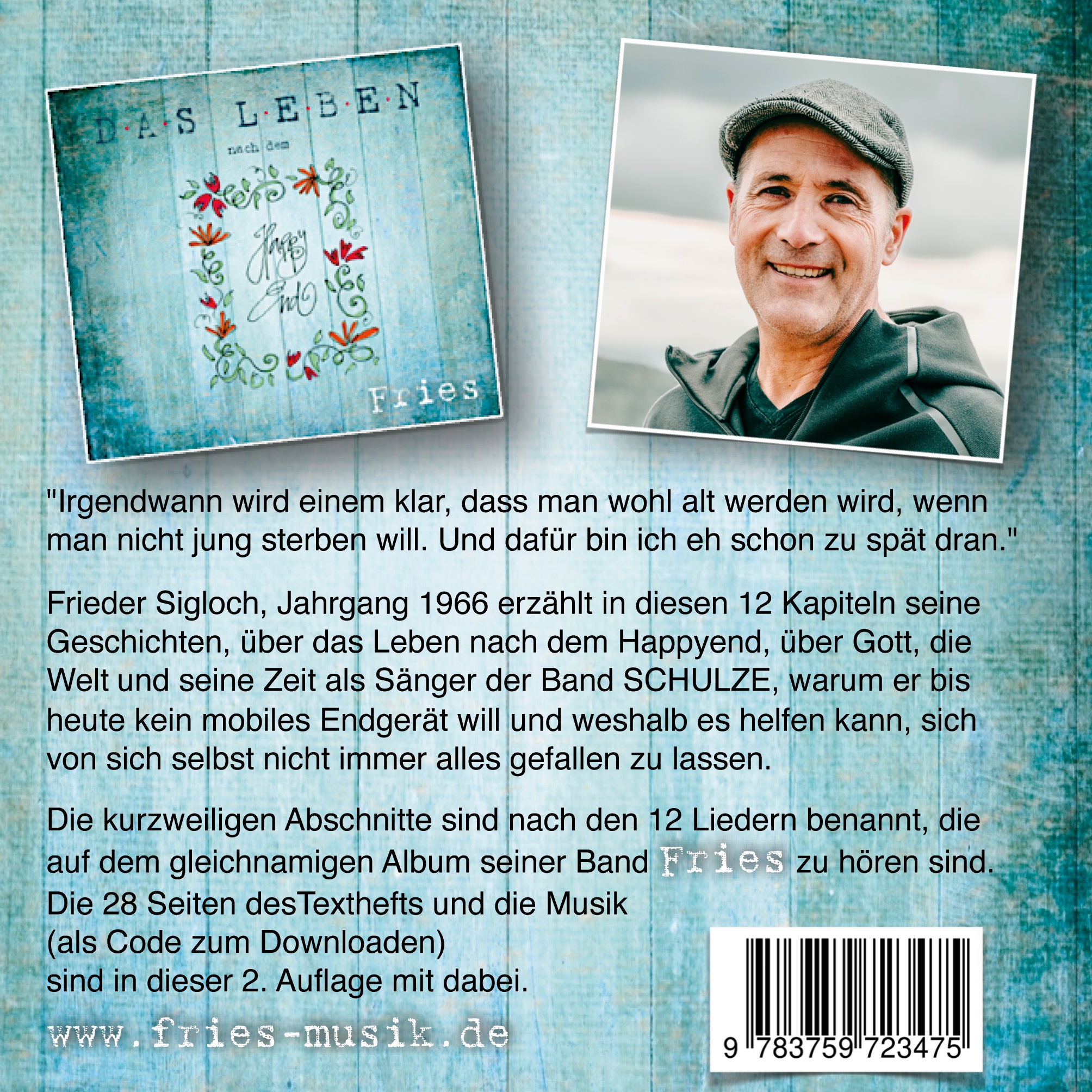 Frieder Sigloch (geb. 1966) startet 20 Jahre nach seiner Zeit als Sänger Texter und Komponist bei der Band Schulze mit seiner Band FRIES nochmal ein neues Herzens-Projekt. Im Hauptberuf ist der gelernte Schreiner als Technik-Lehrer an einem SBBZ für Kinder mit Förderbedarf Geistiger Entwicklung tätig. Verheiratet, mit zwei inzwischen erwachsenen Kindern, wohnt er in Neuffen. Seine neuen Lieder aufzunehmen ohne Kompromisse und unabhängig davon, ob es außer ihm noch jemand gefällt, war der Startgedanke. In der Zusammenarbeit mit dem Musikproduzenten, früherem SCHULZE-Weggefährten und Freund Udo Rinklin konnte dieses Album unter dem Titel: - das Leben nach dem Happyend -, realisiert werden. Zudem gibt er in diesem Buch mit Geschichten hinter den musikalischen Geschichten viele Einblicke in seine Lebens- und Gedankenwelt.