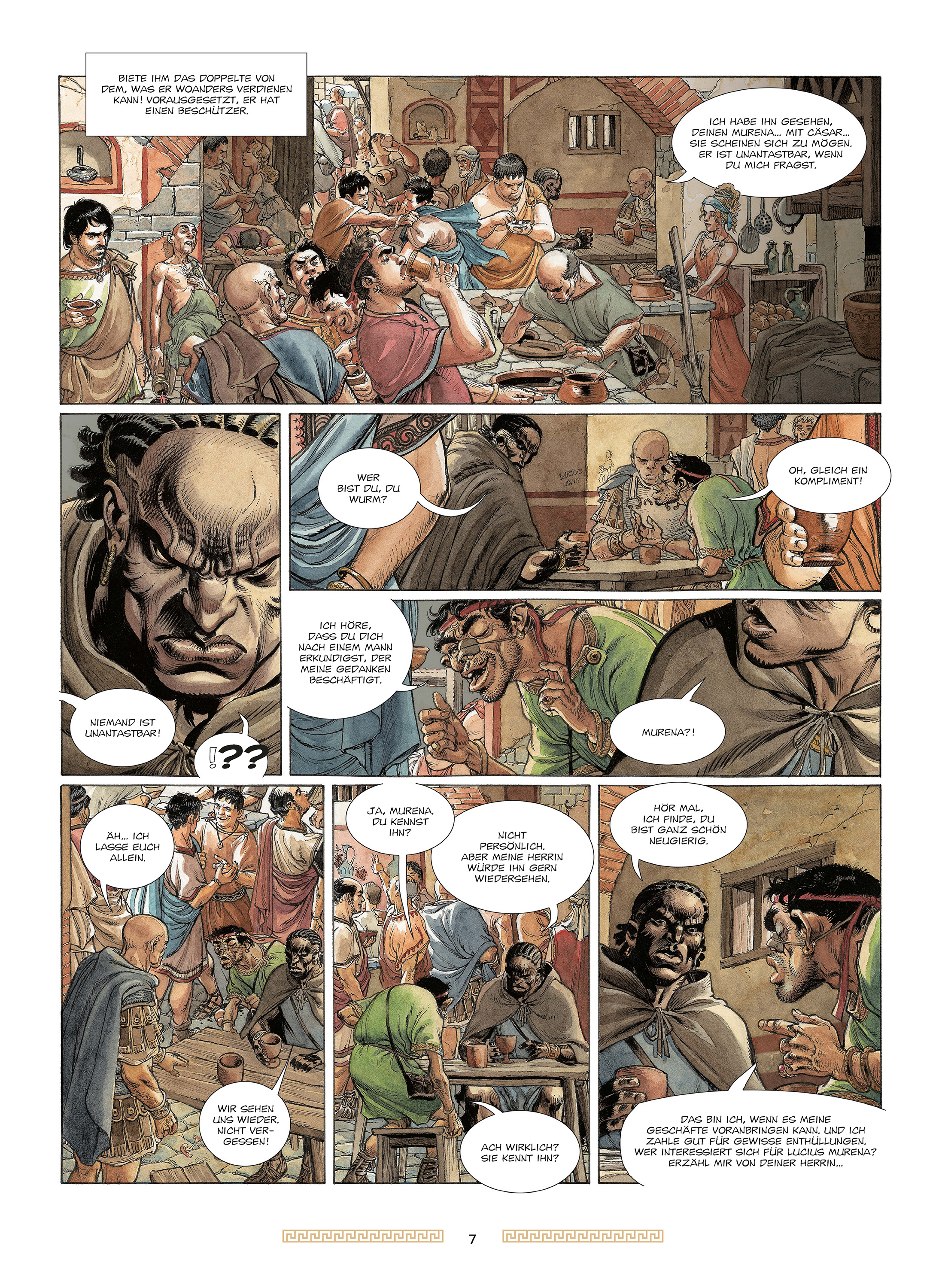 Jean Dufaux (»Giacomo C.«, »Kreuzzug«, »Conquistador« etc.), Philippe Delaby und jetzt Theo (»Der tönerne Thron«) haben exakt dieses düster schillernde Kapitel der römischen Kaiserzeit gewählt, um mit »Murena« ein packendes historisches Drama zu inszenieren, das geschickt geschichtliche Fakten und Fiktion miteinander verwebt. Im Mittelpunkt steht neben Nero vor allem der gleichaltrige Lucius Murena, mit ersterem anfangs durchaus befreundet. Er gerät jedoch schon früh in die tödlichen Intrigen bei Hofe und wird so zum erbitterten Gegner Neros, der mehr und mehr dem Cäsarenwahn verfällt. Das alles präsentieren Dufaux und Theo vor einem detaillierten Panorama der antiken Lebenswelt, penibel recherchiert und akribisch umgesetzt. Und nebenbei geben sie auch noch eine Antwort darauf, wer nun Rom wirklich angezündet hat. Und warum. Schon heute ein Klassiker des History-Comics.