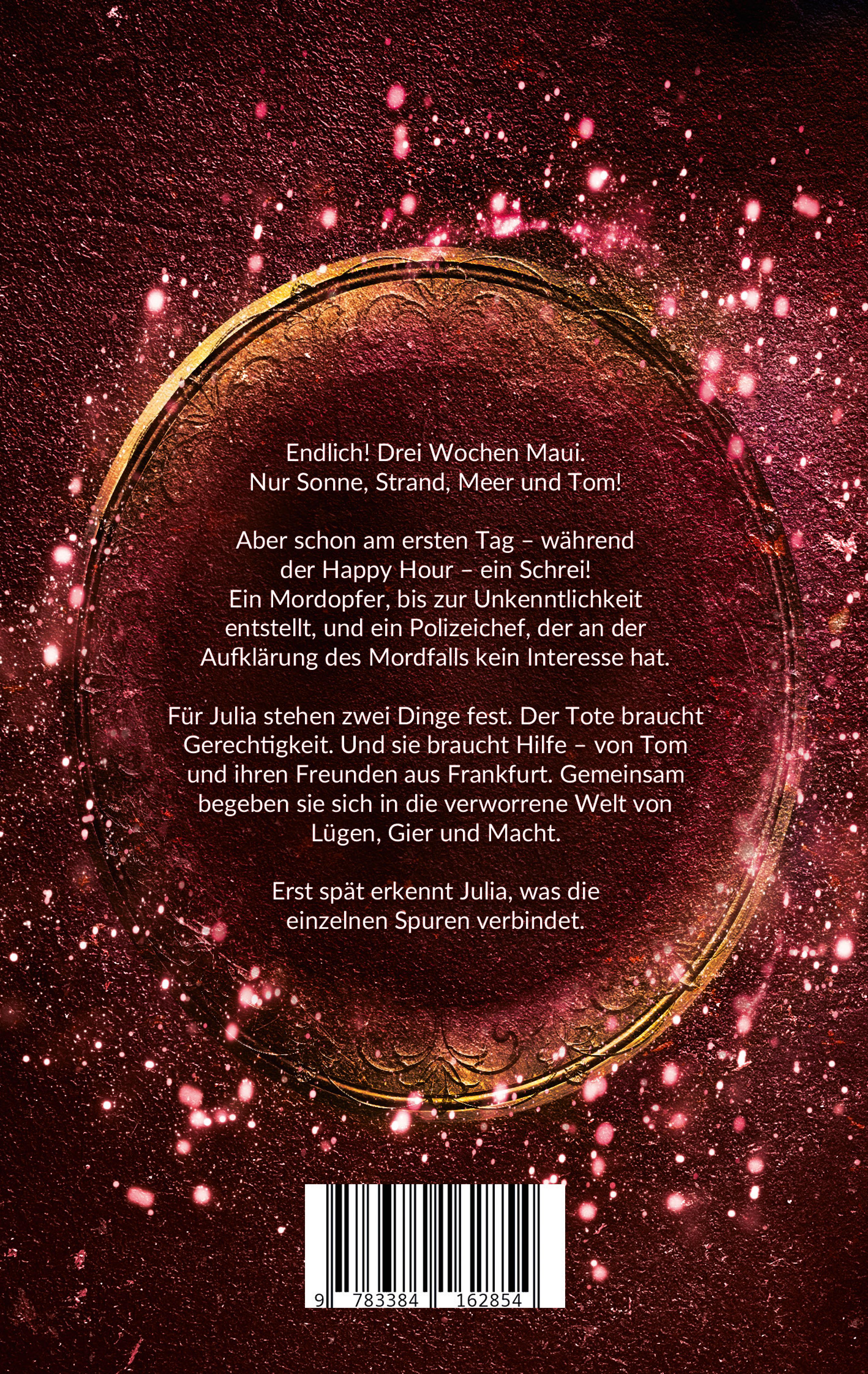 Endlich!Drei Wochen Maui. Nur Sonne, Strand, Meer und Tom! Aber schon am ersten Tag - während der Happy Hour - ein Schrei! Ein Mordopfer, bis zur Unkenntlichkeit entstellt, und ein Polizeichef, der an der Aufklärung des Mordfalls kein Interesse hat. Für Julia stehen zwei Dinge fest. Der Tote braucht Gerechtigkeit. Und sie braucht Hilfe - von Tom und ihren Freunden aus Frankfurt. Gemeinsam begeben sie sich in die verworrene Welt von Lügen, Gier und Macht. Erst spät erkennt Julia, was die einzelnen Spuren verbindet.