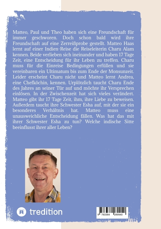 Matteo und Paul sind Hobby-Musiker mit einer kleinen Blues-Band. Theo ist Unternehmer und ein Charmeur, dem die Frauen zu Füßen liegen. Durch eine Weiterbildung haben sich die drei gefunden, und schwören eine Freundschaft für immer. Jede Woche am Donnerstag, treffen sie sich in einer Kneipe, zum Gedankenaustausch. Bis Matteo mit seiner Freundin Clara erscheint, denn alle mögen Clara. Theo gewinnt hinterlistig Claras Liebe und heiraten übereilt. Daraufhin geht Paul, mit Claras Freundin Jola, eine Verbindung ein. Matteo ist aller Illusionen beraubt und unternimmt zu seiner Wiederfindung, eine Indien-Nord-Tour. Er lernt auf dieser Indien-Tour die Reiseleiterin Charu Amal kennen. Charu ist eine selbstlose, liebende Frau, die sich eine Zukunft mit Matteo wünscht. Beide verlieben sich ineinander und versprechen sich, am letzten Reisetag, beim Besuch des Taj Mahals, in Deutschland zu heiraten. Sie vereinbaren ein Ultimatum, bis zum Ende der Monsunzeit. Wie Charus Eltern davon erfahren, zeigt sich der aufgestaute Hass ihres traditionsbewussten Vaters. Charu kommt mit dem Leben davon und wird von ihrer Familie ausgeschlossen. Einzig und allein hält Esha, ihre jüngere Schwester, treu zu ihr. Beide haben ein tiefes Verhältnis zueinander. Esha verspricht Charu aus Dankbarkeit beim Abschied, für sie alles zu tun. Leider erscheint Charu nicht und Matteo lernt Andrea, eine Chefköchin, kennen. Urplötzlich taucht Charu Ende des Jahres an seiner Tür auf und möchte ihr Versprechen einlösen. In der Zwischenzeit hat sich viel verändert und Matteo vermutet eine List. Aus diesem Grund gibt Matteo ihr 17 Tage Zeit, ihre Liebe zu beweisen. Charu gewinnt die Liebe von Matteo wieder und heiraten. Durch die Misshandlung ihrer Familie trägt sie eine Krankheit in sich. Während ihrer Schwangerschaft holt sie notgedrungen ihre Schwester zu sich, denn ihre Überlebenschancen sind gering. Das veranlasst Charu, aus Liebe, Eshas Versprechen an ihr einzulösen.Zu ihrem Leidwesen kommt eine Tochter zur Welt und wird trotz Todesgefahr wieder schwanger. Charu weiß, dass ihre Liebe und ihr Leben zu Ende geht. Deshalb fasste sie einen Plan, dass Esha ihre Kinder erziehen, und Matteo sie heiraten soll. Damit würde ihre Liebe nicht sterben und ihre Kinder gesichert aufwachsen. Esha verspricht es ihr, weil sie Matteo liebt. Charu gebiert den von ihr ersehnten Sohn, und erholt sich nicht mehr. Die Liebe zu Matteo, war stärker als der Tod. In ihren letzten 17 Tagen, bereitet sie Matteo schrittweise darauf vor, Esha zu heiraten. Beim letzten Gespräch, übergibt sie ihre Kinder und ihren Mann an Esha, und stirbt nach deren beider Versprechen. Die Welt von Matteo ist am Ende. Esha ist eine willensstarke Frau und setzt alle Hebel in Bewegung, ihr Versprechen einzuhalten. Sie erzieht "ihre Kinder" trotz ihres Studiums, und setzt ihre Zeit und Kraft dafür ein. Leider fehlt die Liebe von Matteo zu ihr, was sie sehr belastet. Matteo dagegen, hat wegen des Altersunterschiedes von 13 Jahren, seine Bedenken. Esha liebt "ihre Kinder" sehr. Jedoch verlangt ihr das Studium mit dem Haushalt alles ab und ist am Ende. In einem passenden Moment, beim Picknick, führt Esha das entscheidende Gespräch. Für sie gibt es keinen Ausweg mehr. Sie zeigt Matteo, dass die Kinder sie als Mama betrachten und wie ihre Eigenen sind. Sie erinnert ihn an sein Versprechen an Charu, ihre Liebe zu ihm, und dass sie bereits eine Familie sind. Esha besteht auf eine sofortige Aussage. Matteo muss eine Entscheidung fällen.