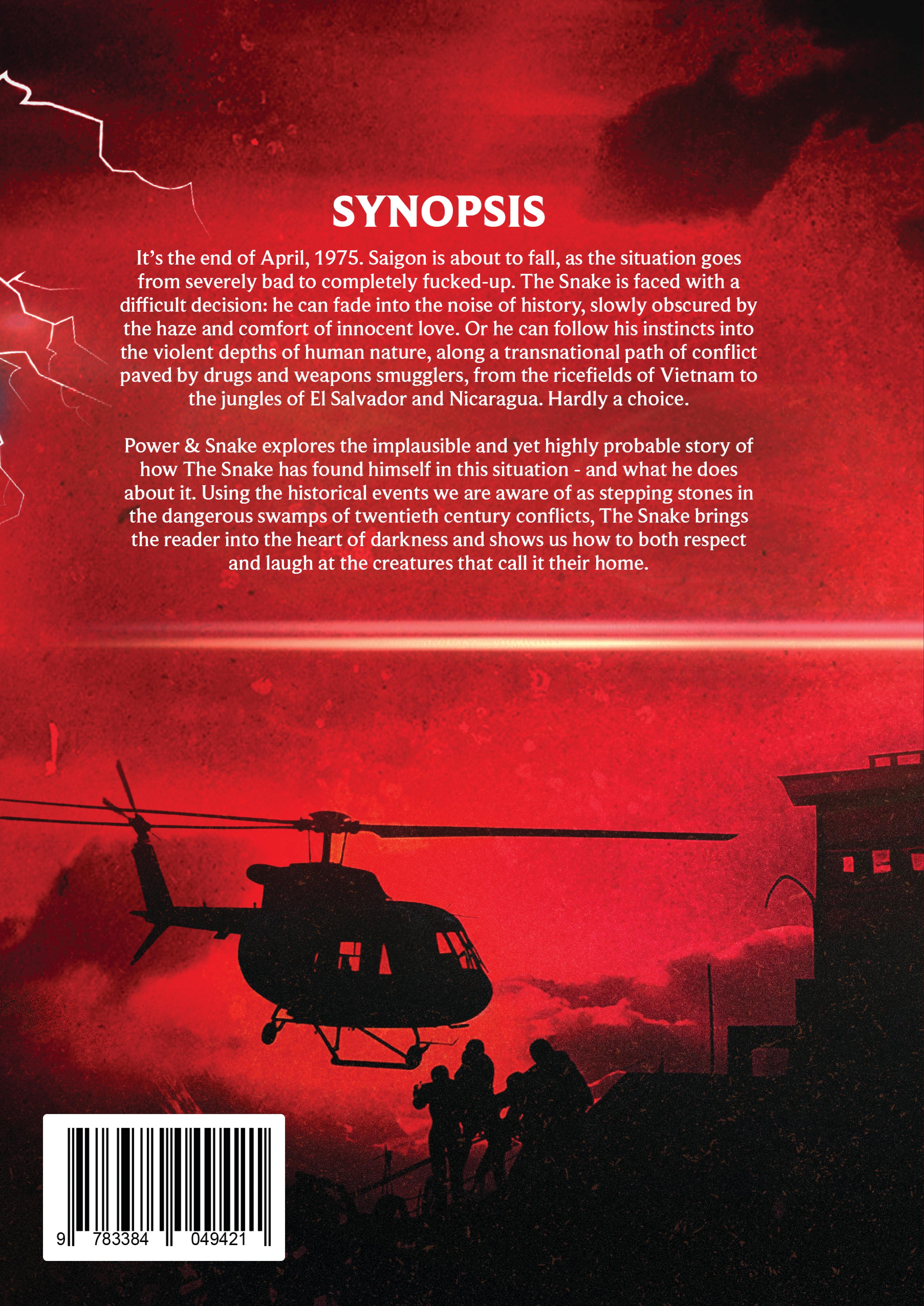 It's the end of April, 1975. Saigon is about to fall, as the situation goes from severely bad to completely fucked-up. The Snake is faced with a difficult decision: he can fade into the noise of history, slowly obscured by the haze and comfort of innocent love. Or he can follow his instincts into the violent depths of human nature, along a transnational path of conflict paved by drugs and weapons smugglers, from the ricefields of Vietnam to the jungles of El Salvador and Nicaragua. Hardly a choice. Power & Snake explores the implausible and yet highly probable story of how The Snake has found himself in this situation - and what he does about it. Using the historical events we are aware of as stepping stones in the dangerous swamps of twentieth century conflicts, The Snake brings the reader into the heart of darkness and shows us how to both respect and laugh at the creatures that call it their home.