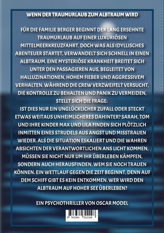 Oscar Model, ein bemerkenswerter junger Autor aus Berlin, hat sich mit nur 20 Jahren entschlossen, die literarische Welt zu betreten. Geboren und aufgewachsen in der dynamischen Hauptstadt Deutschlands, hat Oscar die kulturelle Vielfalt und die reiche Geschichte Berlins in seine kreative Arbeit einfließen lassen. Schon früh entwickelte er eine Leidenschaft für das Schreiben und zeigte ein außergewöhnliches Talent für das Erzählen fesselnder Geschichten. "Mann über Bord" ist Oscars Debütroman, ein Psychothriller, der die Leser auf eine nervenaufreibende Reise mitnimmt. Die Geschichte beginnt als idyllischer Familienurlaub auf einer luxuriösen Mittelmeerkreuzfahrt, doch bald verwandelt sich das Abenteuer in einen Albtraum. Eine mysteriöse Krankheit breitet sich unter den Passagieren aus, und die Familie Berger findet sich in einem Strudel aus Angst, Misstrauen und Überlebenskampf wieder. Oscars geschickte Erzählweise und sein Gespür für psychologische Tiefe haben ihm bereits vor der Veröffentlichung eine wachsende Fangemeinde eingebracht. Oscar Model ist nicht nur ein talentierter Autor, sondern auch ein kreativer Visionär. Seine Geschichten sind geprägt von einer Mischung aus realistischen Szenarien und tiefgründigen psychologischen Elementen, die den Leser unterbewusst zum Nachdenken anregen. Er versteht es, die Spannung zu steigern und unerwartete Wendungen einzubauen, die den Leser fesseln und überraschen. Trotz seines jungen Alters zeigt Oscar eine bemerkenswerte Reife und ein tiefes Verständnis für menschliche Emotionen und Verhaltensweisen. Seine Fähigkeit, die dunklen Seiten der menschlichen Natur zu erkunden und dabei dennoch Hoffnung und Menschlichkeit zu bewahren, macht ihn zu einem einzigartigen Talent in der Welt der Literatur. Doch hinter dem Erfolg verbirgt sich auch eine traurige Geschichte. Oscars Leidenschaft für das Schreiben wurde durch den Verlust eines geliebten Menschen geprägt. Diese Erfahrung hat ihn tief berührt und seine Sicht auf das Leben und die menschliche Psyche nachhaltig beeinflusst. In seinen Werken verarbeitet er diese Trauer und schafft es, seine Leser auf eine emotionale Reise mitzunehmen, die von Schmerz, Verlust, aber auch von Hoffnung und Wiedergeburt geprägt ist. Oscar lebt und arbeitet in Berlin, wo er weiterhin an neuen Projekten arbeitet und seine Leser mit weiteren spannenden Geschichten begeistern möchte. Sein Debütroman "Mann über Bord" ist der Auftakt
