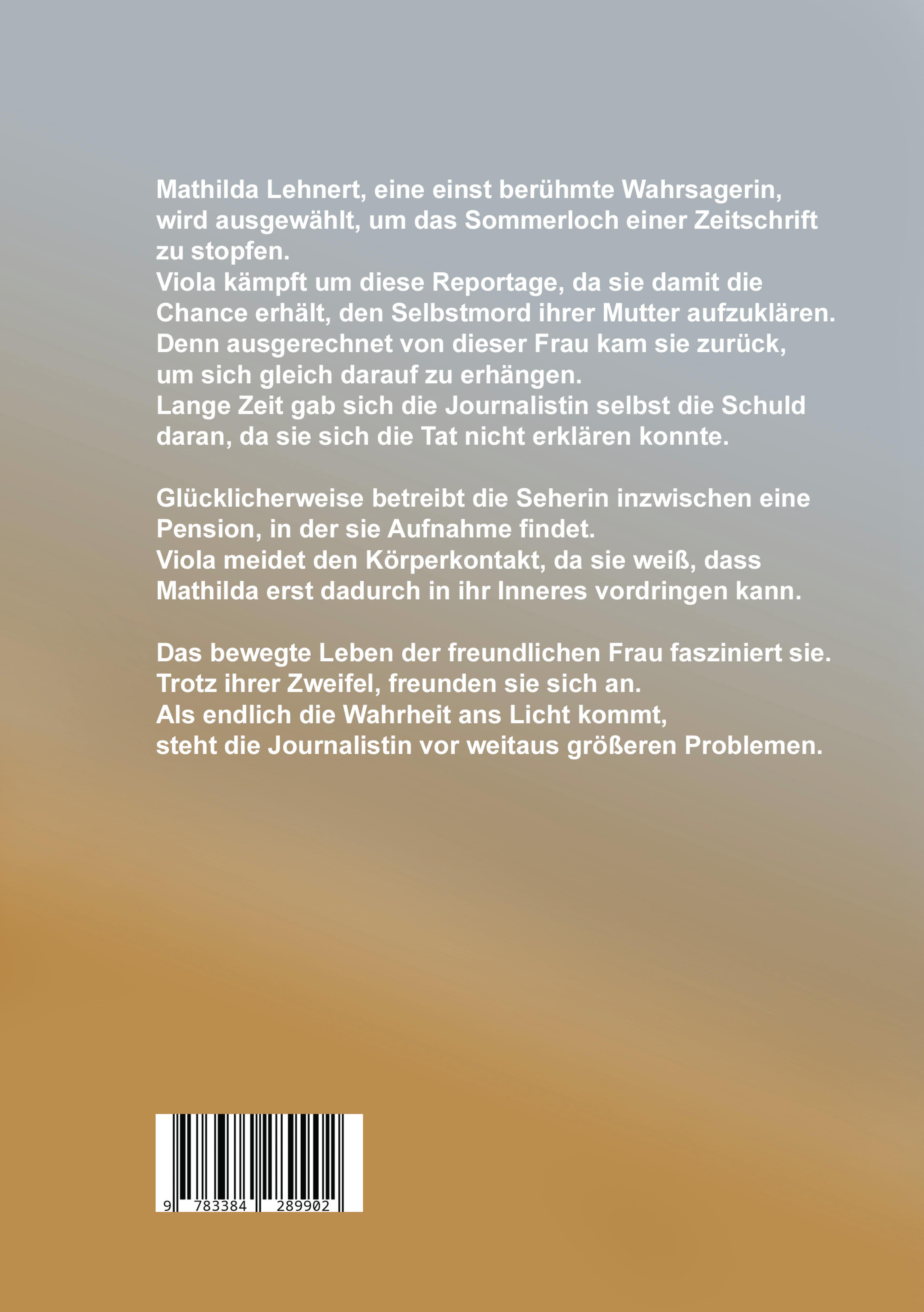 Viola wird hellhörig, als ihre Redaktion eine Reportage über die einst berühmte Wahrsagerin Mathilda Lehnert plant. Sie kämpft um diesen Auftrag, in der Hoffnung, den Selbstmord ihrer Mutter aufklären zu können. Diese erhängte sich, als Viola noch ein Kind war, nachdem sie von einem Besuch bei dieser Frau zurückgekommen war. Hat sie die Mutter in den Tod getrieben? Da der Seherin Einblicke in die Menschen nur durch körperlichen Kontakt möglich sind, meidet Viola jede Berührung. Sie befürchtet, keine Antworten zu bekommen, sobald ihre Identität offengelegt ist. Doch das bewegte Leben der alten Dame fasziniert sie. Zudem ist sie ihr ausgesprochen sympathisch. Zweifel kommen auf, ob nicht sie selbst zum Tod der Mutter beigetragen hatte. Was sie dann erfährt, stürzt Viola in tiefe Seelenqualen. Zugleich sieht sie sich einer gefährlichen Aufgabe gegenüber.
