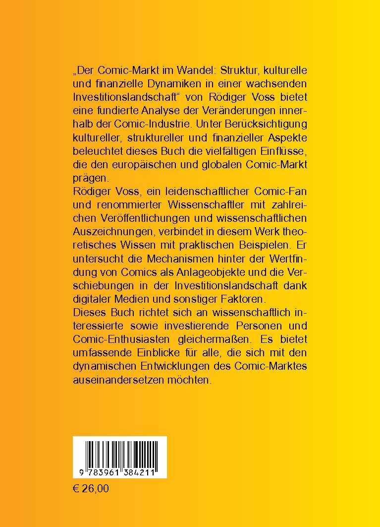 Rödiger Voss, ein leidenschaftlicher Comic-Fan und renommierter Wissenschaftler mit zahlreichen Veröffentlichungen und wissenschaftlichen Auszeichnungen, verbindet in diesem Werk theoretisches Wissen mit praktischen Beispielen. Er untersucht die Mechanismen hinter der Wertfindung von Comics als Anlageobjekte und die Verschiebungen in der Investitionslandschaft dank digitaler Medien und sonstiger Faktoren.