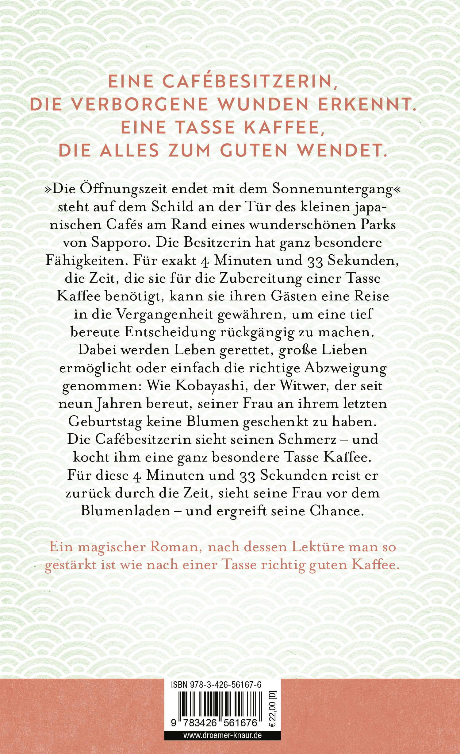 "Die Öffnungszeit endet mit dem Sonnenuntergang" steht auf dem Schild an der Tür des kleinen japanischen Cafés am Rand eines wunderschönen Parks von Sapporo. Die Besitzerin Frau Hayari ist eine Barista mit ganz besonderen Fähigkeiten. Exakt 4 Minuten und 33 Sekunden, die Zeit, sie für die Zubereitung einer Tasse Kaffee benötigt, kann sie ihren Gästen eine Reise in die Vergangenheit gewähren, um eine tief bereute Entscheidung rückgängig zu machen. Dabei werden Leben gerettet, große Lieben ermöglicht oder einfach die richtige Abzweigung genommen: