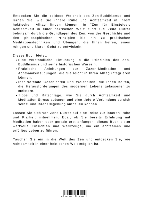 Entdecken Sie die zeitlose Weisheit des Zen-Buddhismus und lernen Sie, wie Sie innere Ruhe und Achtsamkeit in Ihrem hektischen Alltag finden können. In "Zen für Einsteiger: Achtsamkeit in einer hektischen Welt" führt Sie Zeno Durrer behutsam durch die Grundlagen des Zen, von der Geschichte und den philosophischen Prinzipien bis hin zu praktischen Meditationstechniken und Übungen, die Ihnen helfen, einen ruhigen und klaren Geist zu entwickeln.Dieses Buch bietet:Eine verständliche Einführung in die Prinzipien des Zen-Buddhismus und seine historischen Wurzeln.Praktische Anleitungen zur Zazen-Meditation und Achtsamkeitsübungen, die Sie leicht in Ihren Alltag integrieren können.Inspirierende Geschichten und Weisheiten, die Ihnen helfen, die Herausforderungen des modernen Lebens gelassener zu meistern.Tipps und Ratschläge, wie Sie durch Achtsamkeit und Meditation Stress abbauen und eine tiefere Verbindung zu sich selbst und Ihrer Umgebung aufbauen können.Lassen Sie sich von Zeno Durrer auf eine Reise zur inneren Ruhe und Klarheit mitnehmen. Egal, ob Sie bereits Erfahrung mit Meditation haben oder gerade erst anfangen, dieses Buch bietet wertvolle Einsichten und Werkzeuge, um ein achtsames und erfülltes Leben zu führen.Tauchen Sie ein in die Welt des Zen und entdecken Sie, wie Achtsamkeit in einer hektischen Welt möglich ist.