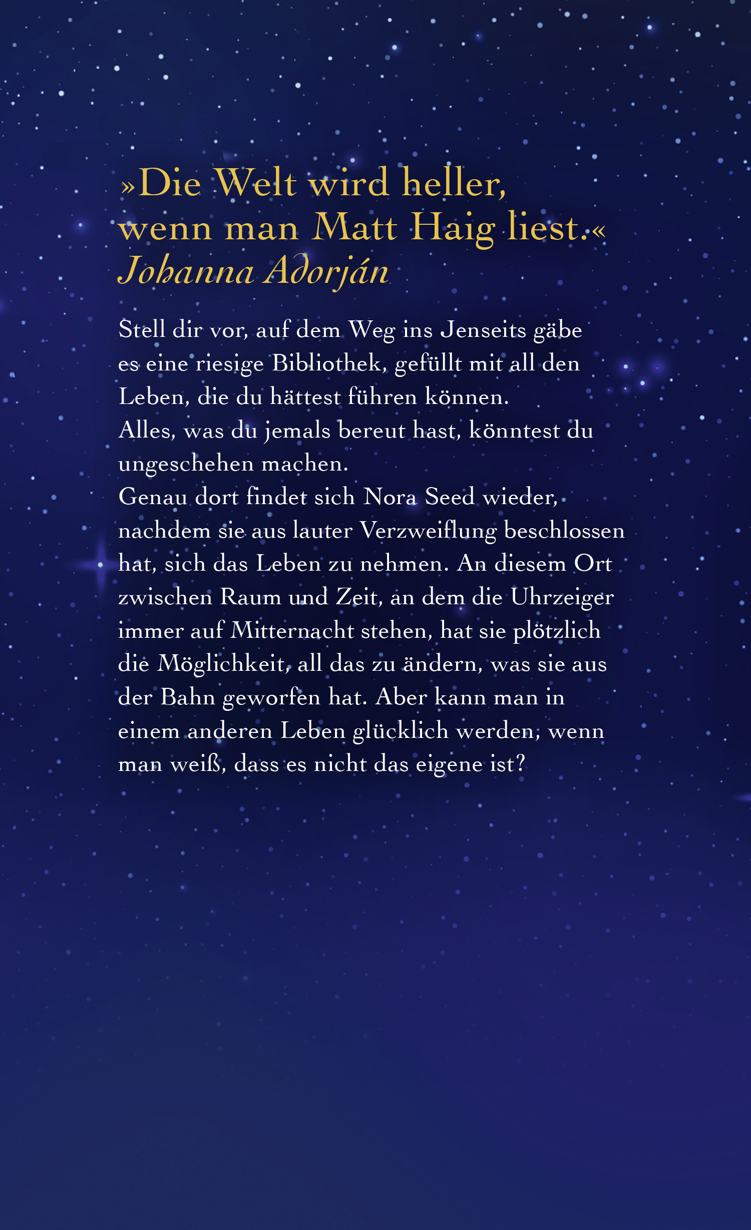 Stell dir vor, auf dem Weg ins Jenseits gäbe es eine riesige Bibliothek, gefüllt mit all den Leben, die du hättest führen können. Alles, was du jemals bereut hast, könntest du ungeschehen machen. Genau dort findet sich Nora Seed wieder, nachdem sie aus lauter Verzweiflung beschlossen hat, sich das Leben zu nehmen. An diesem Ort zwischen Raum und Zeit, an dem die Uhrzeiger immer auf Mitternacht stehen, hat sie plötzlich die Möglichkeit, all das zu ändern, was sie aus der Bahn geworfen hat. Aber kann man in einem anderen Leben glücklich werden, wenn man weiß, dass es nicht das eigene ist?