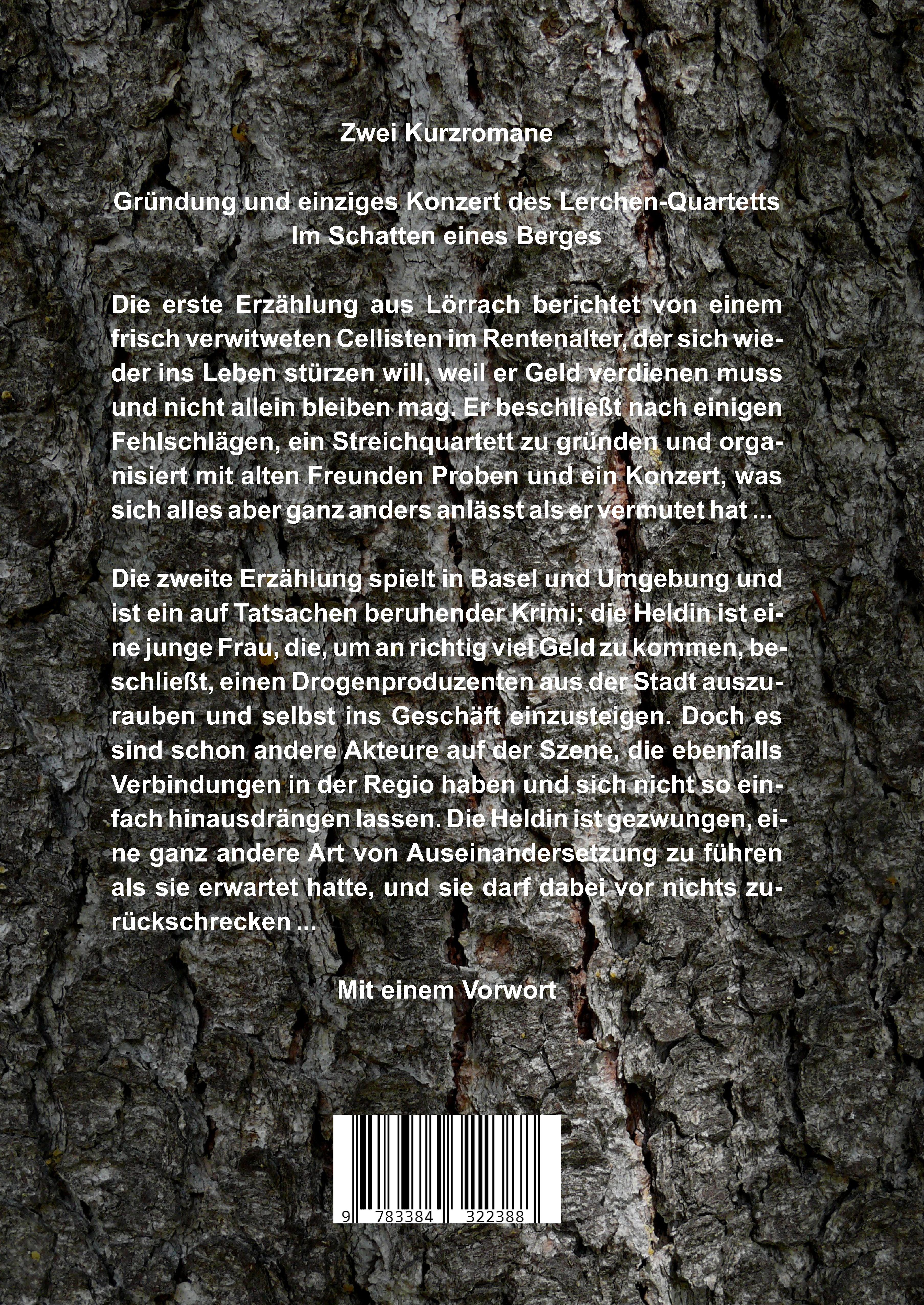 Zwei Kurzromane Gründung und einziges Konzert des Lerchen-Quartetts Im Schatten eines Berges Die erste Erzählung aus Lörrach berichtet von einem frisch verwitweten Cellisten im Rentenalter, der sich wieder ins Leben stürzen will, weil er Geld verdienen muss und nicht allein bleiben mag. Er beschließt nach einigen Fehlschlägen, ein Streichquartett zu gründen und organisiert mit alten Freunden Proben und ein Konzert, was sich alles aber ganz anders anlässt als er vermutet hat ... Die zweite Erzählung spielt in Basel und Umgebung und ist ein auf Tatsachen beruhender Krimi; die Heldin ist eine junge Frau, die, um an richtig viel Geld zu kommen, beschließt, einen Drogenproduzenten aus der Stadt auszurauben und selbst ins Geschäft einzusteigen. Doch es sind schon andere Akteure auf der Szene, die ebenfalls Verbindungen in der Regio haben und sich nicht so einfach hinausdrängen lassen. Die Heldin ist gezwungen, eine ganz andere Art von Auseinandersetzung zu führen als sie erwartet hatte, und sie darf da-bei vor nichts zurückschrecken ...Mit einem Vorwort