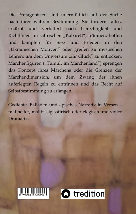 | Schlagworte | Gedichte & Balladen • gesellschaftskritische themen • Krieg in der Ukraine • Märchenmotive • Mystische Lehren • Pamphlet • Satire • Visionen |